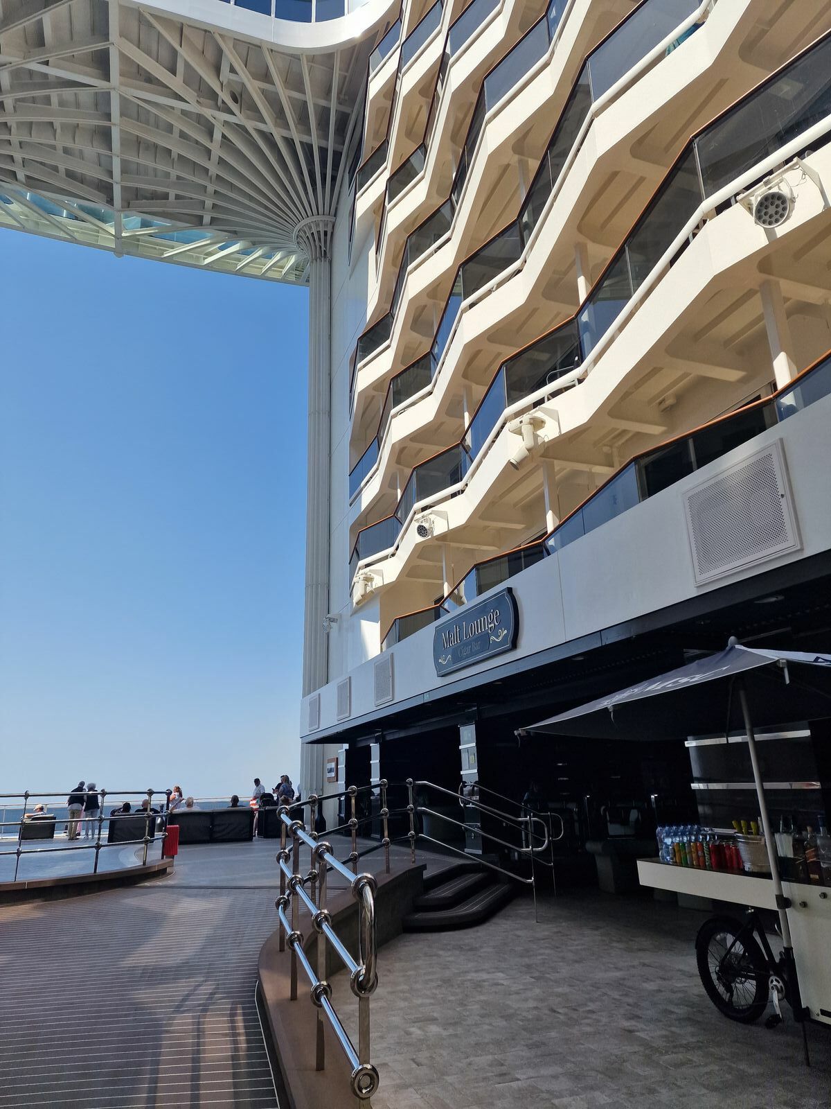 Ich sitze gerade hinten mit Blick auf die Heckwelle. Der Bereich ist sehr schön und ruhig, aber der MSC ist wohl das Geld ausgegangen, weil so wenig Sitzgelegenheiten da sind. Es gibt hier eine Malt Cigar Bar, eine Konditorei, das Fischrestaurant, die Kaffeebar. Und ja, es sieht ziemlich mager aus, da hätte man noch andere Bars einbauen sollen, mit Sitzgelegenheiten davor, das wäre der Knaller. Weil der Platz ist echt schön.