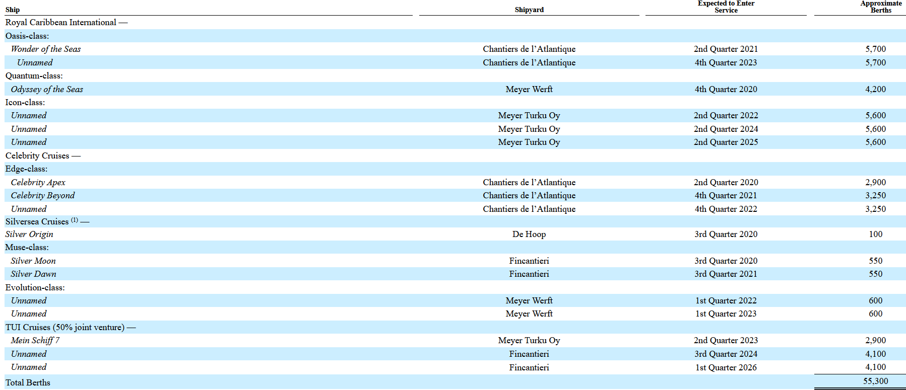 Heute Abend hat Royal Caribbean (Joint Venture Mutter von TUI Cruises) im Quartalsbericht für das dritte Quartal 2021 endlich auch die neuen Auslieferungstermine für die beiden großen Schiffe aus Italien vermerkt. Überaschenderweise verzögern sich diese nur um jeweils ein Quartal. Dadurch, dass diese neuen, veränderten Termine jetzt vermerkt wurden ist nicht mehr mit größeren Änderungen zu rechnen. Fincantieri scheint auch aufgrund des vor der Pandemie deutlich prächtiger gefüllten Auftragsbuches (bis 2027) deutlich weniger Druck als Meyer und Chantiers de l’Atlantique aus st Nazaire gehabt zu haben die Bestellungen auf einen längeren Zeitraum zu strecken. Damit bekommt TUI in 2024 tatsächlich zwei Neubauten. Die Mein Schiff 7 kommt rechtzeitig (verspätet) zur Sommersaison im zweiten Quartal 2024 (April bis Juni) und verspätet sich wie bereits seit den letzten Quartalsberichten aus dem April und August bekannt um ein Jahr (urspr. Q2 2023). Die beiden 2.050 Kabinen Schiffe aus Italien kommen nun im vierten Quartal 2024 (Oktober bis Dezember) und im zweiten Quartal 2026 (April bis Juni). Die Mein Schiff 8 war bisher in den letzten Geschäftsberichten mit dem Planungsstand aus der Vor- Corona Zeit noch für das dritte Quartal 2024 und die Mein Schiff 9 für das erste Quartal 2026 vorgesehen.