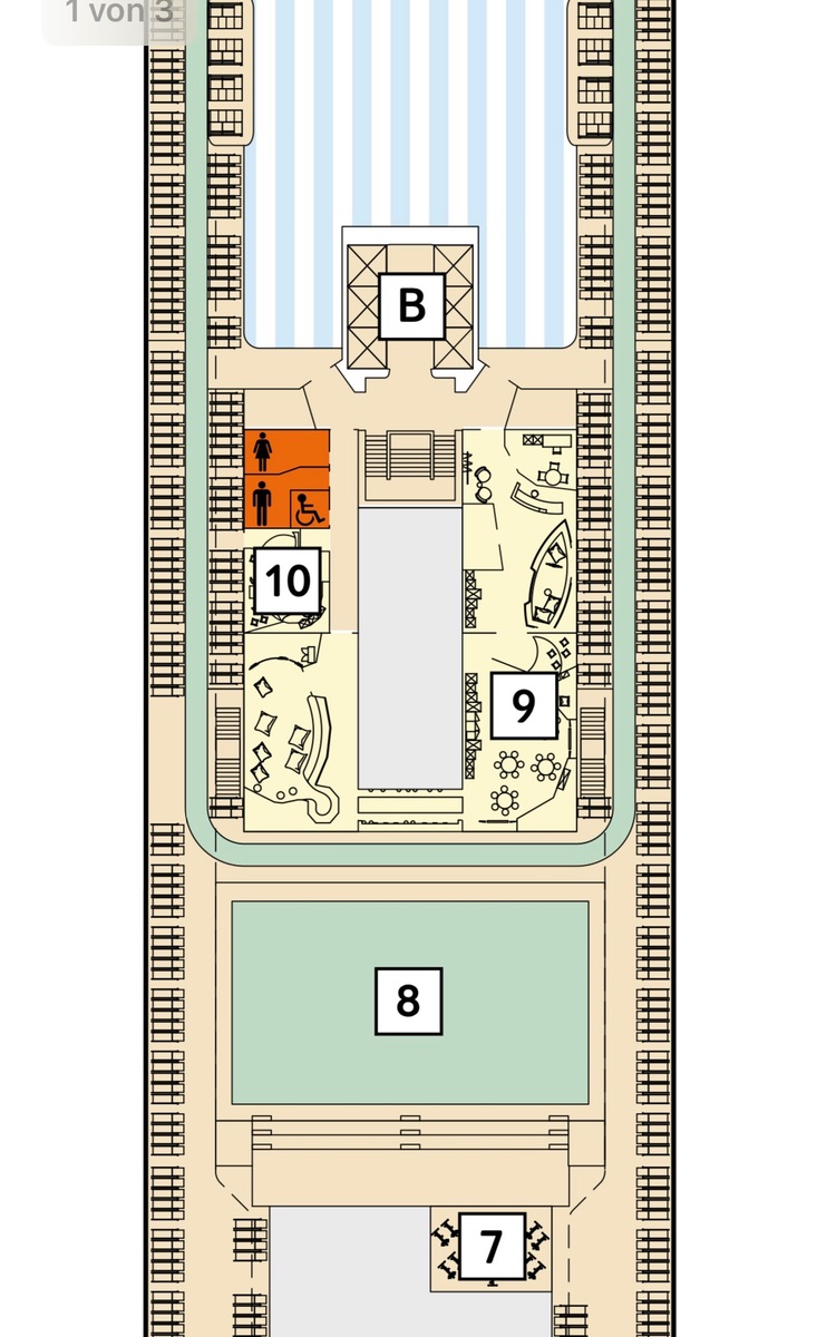 Die Einzelkabinen sind übrigens alle auf Deck 11. Es gibt insgesamt wieder 26 Stück. Davon 10 mit rauchfreiem Balkon, 9 Meerblick und 7 Innen. Die Doppelbettbelegung wird also bei 3864 liegen. Der Unterschied mit 120 zusätzlichen Betten zur Maximalkapazität ist sehr niedrig. Die anderen kleineren Schiffe können 244, 260, 238 und 236 Passagiere mehr befördern. Wenn das so stimmt, dann wird es für die Familien in den Ferien noch schwieriger auf das Schiff zu kommen. Gewissermaßen wird die Mein Schiff Relax dadurch durch die Hintertür zu einem adults only Schiff. Das passt ja auch stückweise zu dem mauen Angebot für Familien im öffentlichen Raum.