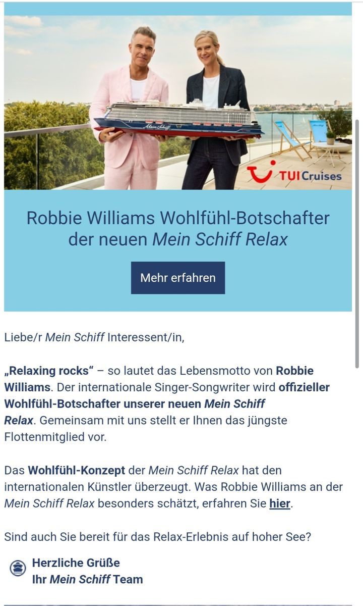 Ich persönlich finde den konzeptionellen Bogen von Robbie Williams zur Mein Schiff Relax zwar etwas gestelzt und "mühselig gewollt", aber das war das TuiCruises-Marketing ja immer schon. Aber um auch bei Menschen außerhalb von Deutschland Aufmerksamkeit für das Produkt zu erhalten, macht so ein international bekanntes Gesicht schon Sinn.