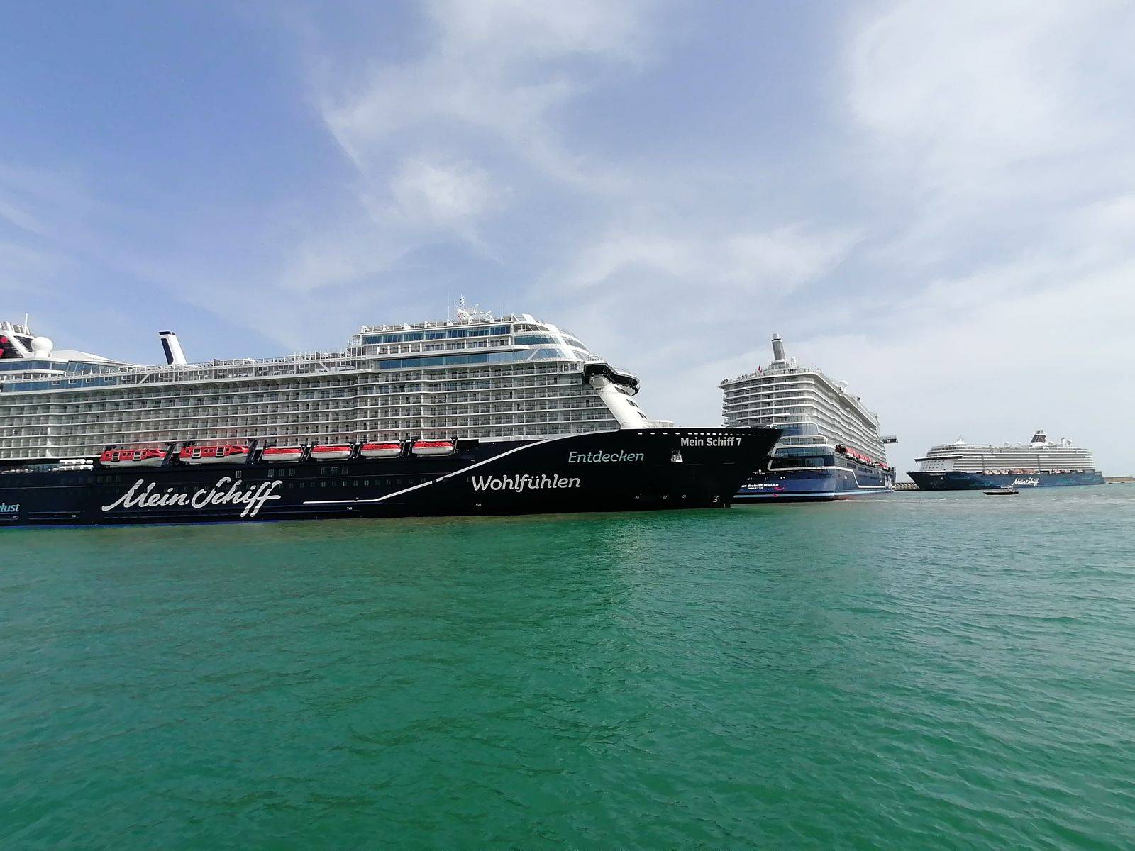 Demnach liegen die Mein Schiff 7 und die Relax am Terminal, wobei die 7 den Platz näher zur Stadt hin hat (A) und die Relax am Platz B liegt. Die 5 hat den Platz an der äußeren Mole und liegt mit dem Bug in Richtung Bug Relax.