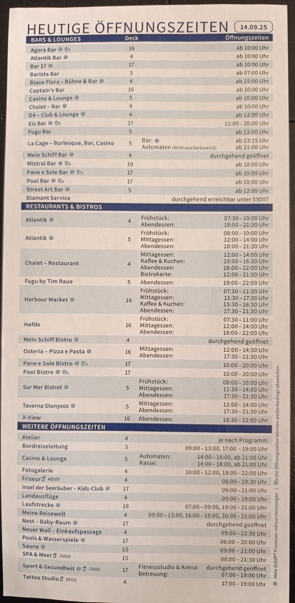 Ach so... Die Öffnungszeiten der Restaurants würden mich interessieren, stehen die ebenfalls im Tagesprogramm?