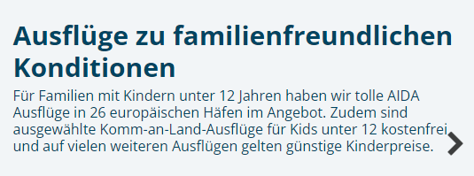 in den Ausflugsbedingungen und auch auf der aktuellen Seite Urlaubskompass zu Landausflügen veröffentlicht AIDA, dass der Kinderpreis für Ausflüge im Alter von 2 - 11 Jahren gilt. Spezielle "Komm-an-Land" Ausflüge sind für Kinder unter 12 kostenfrei. Wenn ich mich nun in eine Reise einlogge, erhalte ich bei allen Kinderpreisen die Info, dass der Kinderpreis nur bis zur "Vollendung des 11.Lebensjahres" gilt. Dies bedeutet also, alle Kinder, die noch nicht 11 sind. AIDA lässt also Kinder unter 12 nicht eigenständig von Bord, verlangt aber für 11-jährige den Erwachsenenpreis für Ausflüge. Dies hat mir das Social-Media-Team auf Facebook auch so bestätigt. Ich kann das aber gar nicht glauben. Hat jemand Erfahrungen mit den Ausflugspreisen für 11-jährige?