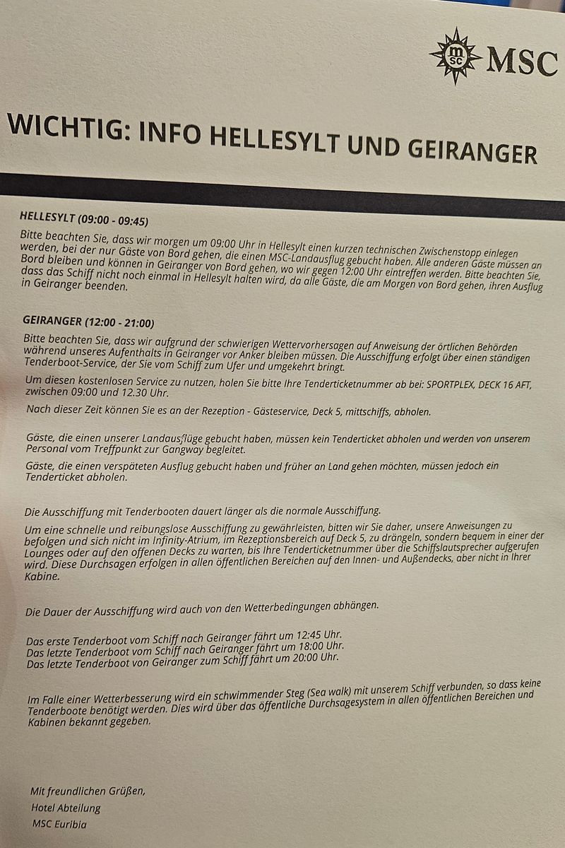 Ein großes Lob hier an die MSC Euribia. Kurz nach dem die Bahn einzelne Sonder-ICEs von Kiel nach Hamburg angekündigt hat, hatte jeder einen Kabinenbrief mit den detaillierten Fahrzeiten für die Rückreise und allen Infos, genauer und kompakter als auf der Seite der DB.