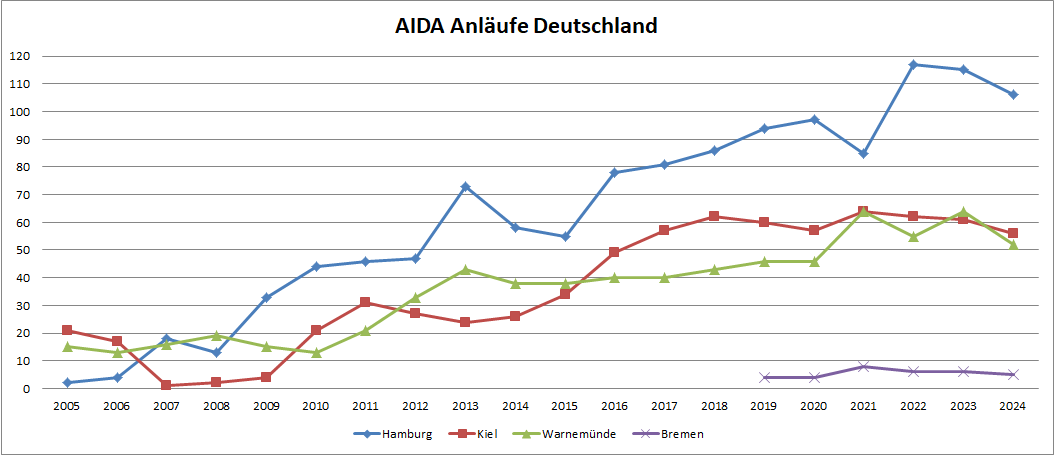 AIDAdiva: 21x Warnemünde, 4x Hamburg