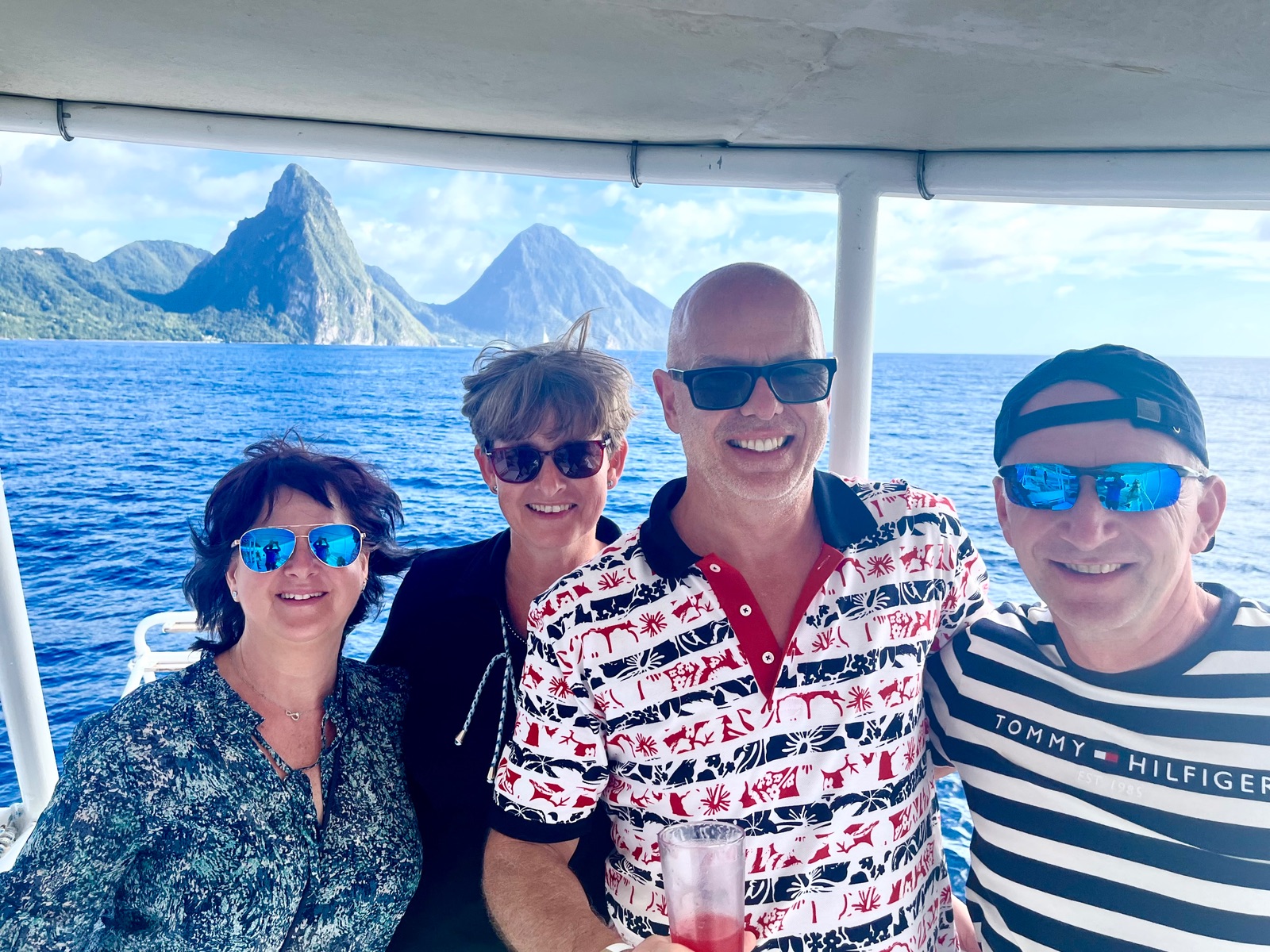 Nach der langen Mittagspause bestiegen wir ( leider mit seeeehr vielen anderen ) ein großes Ausflugsboot , mit dem wir zu den Pitons fuhren und die schöne Küste vom Wasser aus betrachten konnten . Natürlich wieder mit lauter Musik ( diesmal zwischendrin auch deutscher Schlager 😂😂😂) und Rumpunsch gabs auch . Tanzen war leider aufgrund ordentlich Wellenbewegung nicht möglich