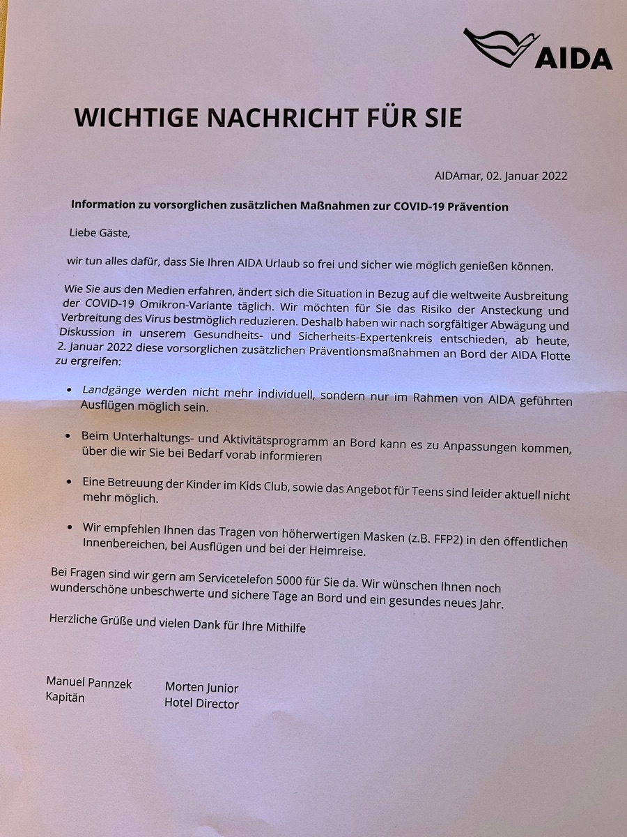 Verschärfen ist ja ok. Wenn dann auch darauf geachtet wird, dass sie eingehalten werden. Als „Verschärfung“ einzuführen, dass nur noch Bubble gilt, finde ich persönlich zu einseitig. Da gibt es an Bord jede Menge, worauf auch geachtet werden kann. Wie z. B. in einem geschlossenen Raum keine Party ohne Maske zumachen und diese aufs offene Pooldeck zu verlegen
