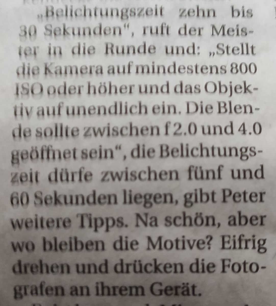 Für die Nordlichtfotografie gibt es - je nach Experten - unterschiedliche Tipps. Ich habe einen Ausschnitt aus einem Artikel der Rheinischen Post angehängt - nach meinen Erfahrungen kann man damit leben: