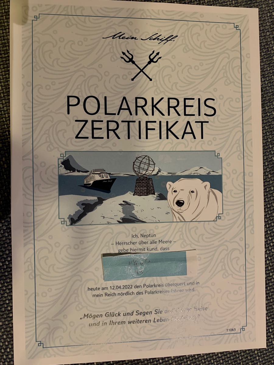 Ein entspanntes Tag gewesen. Schlafen ,paar Cocktails und Massage. Nachmittags gabs auf dem pooldeck Polartaufe. Schön gemacht und weil 2 PAX geopfert worden sind :lol1: war auch sehr schönes Wetter und Ententeich was auf dem Bild zu sehen ist.Auf der Kabine lag dann abends Polarkreis Zertifikat .