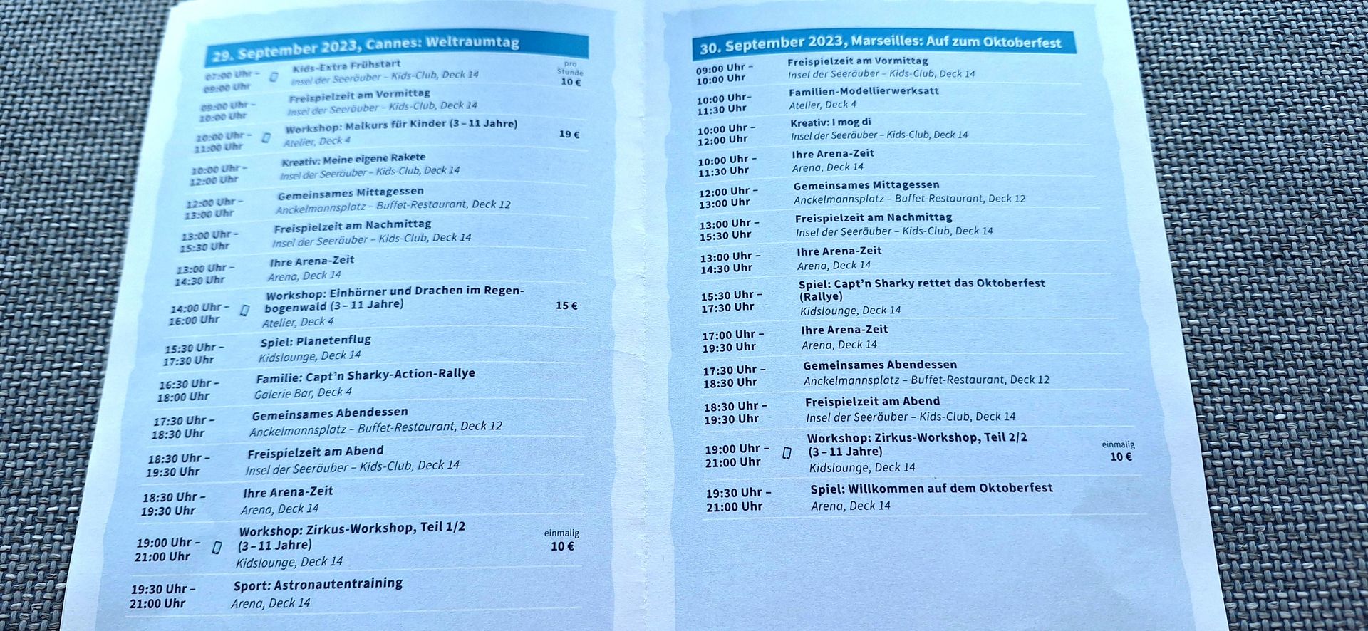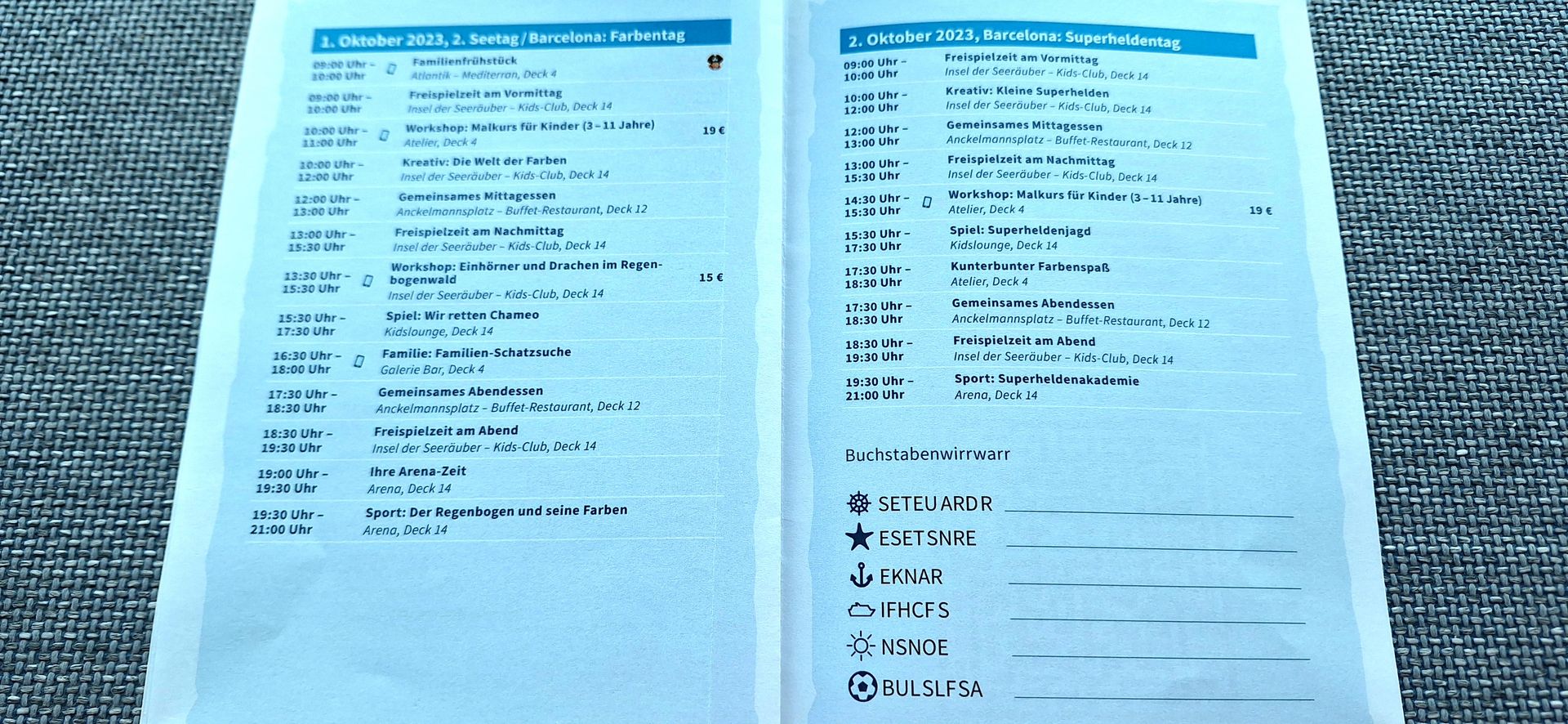 Das ist hier das Kinderprogramm. Man erhält ein Programm für die ganze Reise. Für die Erwachsenen gibt es das Programm täglich auf die Kabine. Und eine Kinderkarte: