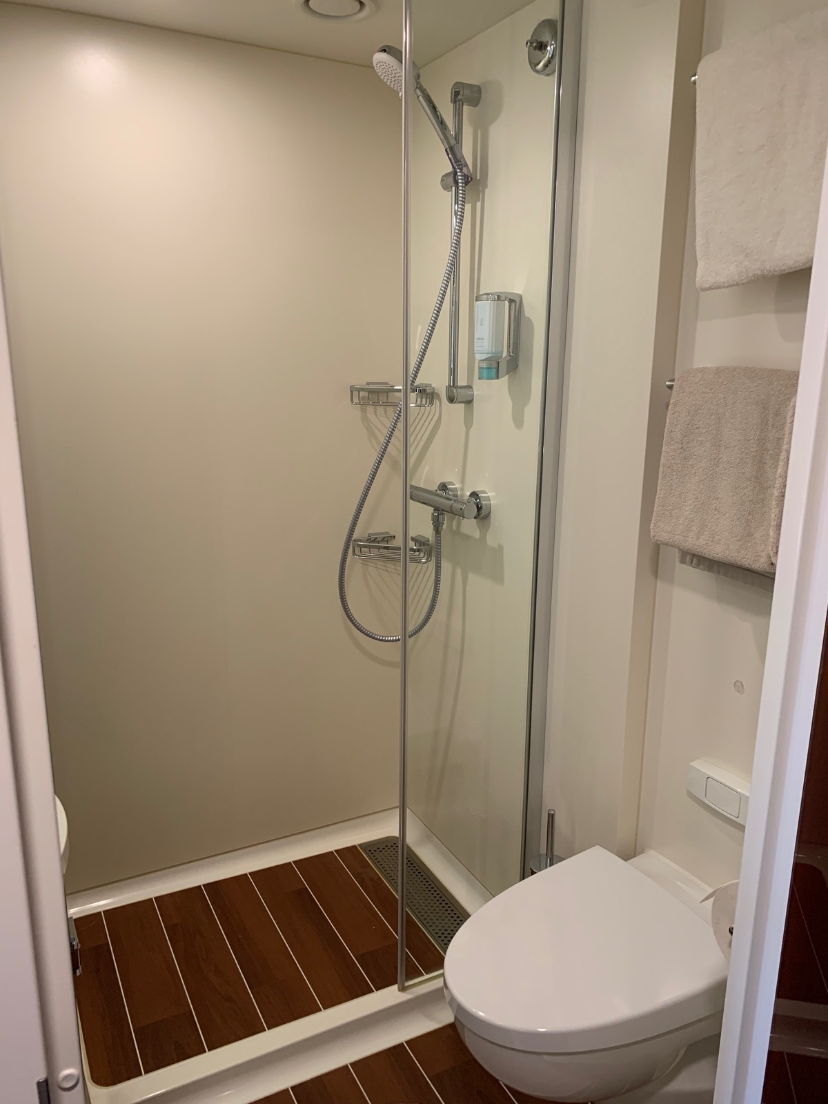 Alle Balkone auf allen Decks habe diese Tür in der Zwischenwand. Ansonsten müssten die Reinigungskräfte während der Balkonreinigung ständig mir ihren nassen Klamotten durch die Kabinen stapfen.