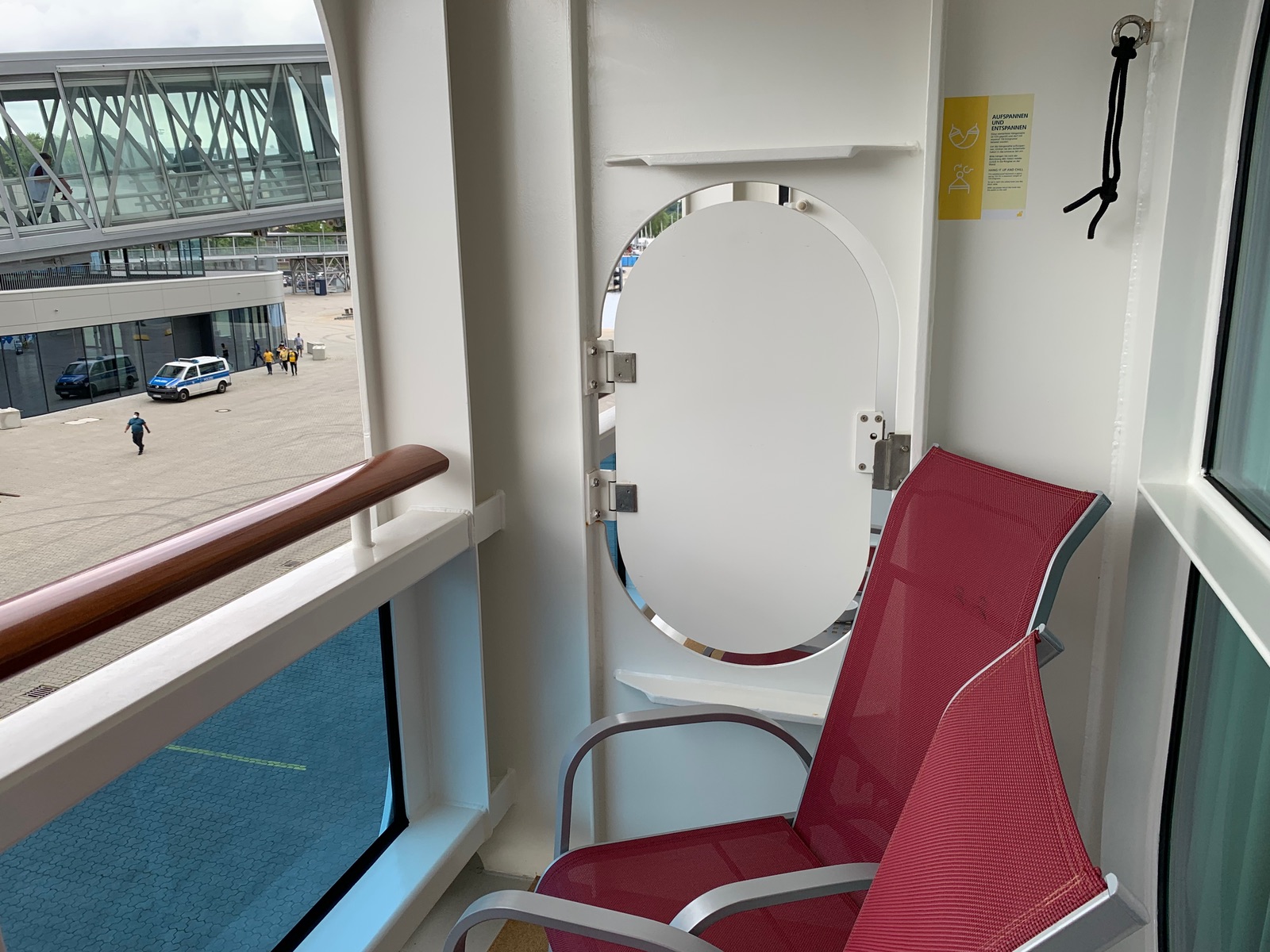 Alle Balkone auf allen Decks habe diese Tür in der Zwischenwand. Ansonsten müssten die Reinigungskräfte während der Balkonreinigung ständig mir ihren nassen Klamotten durch die Kabinen stapfen.
