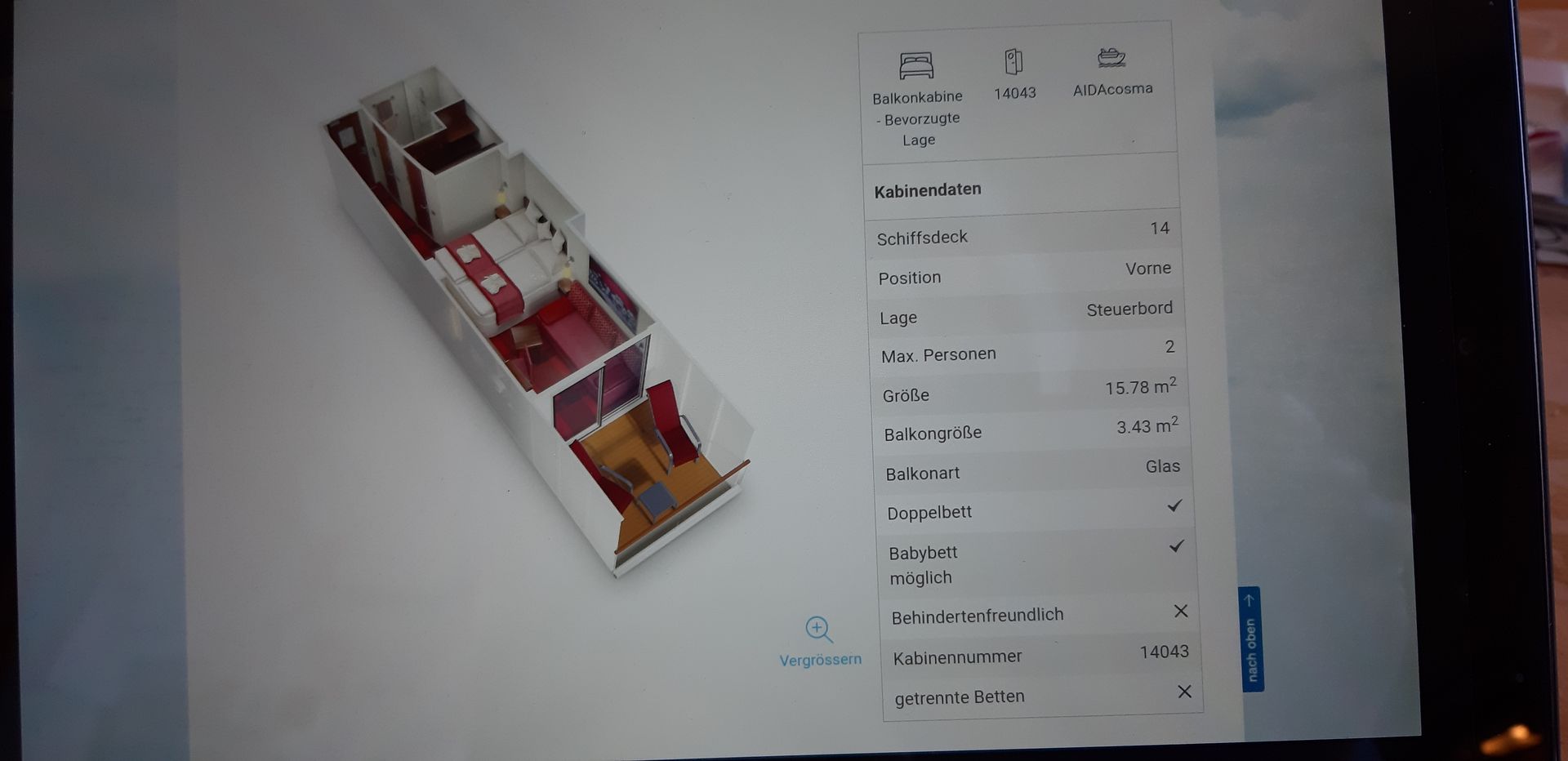Balkonkabine auf der Steuerbordseite. Laut Vorankündigung für maximal zwei Personen.