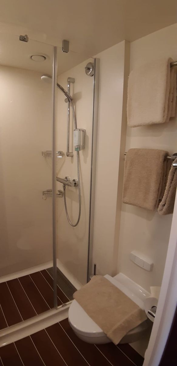 Das Bad ist etwas anders aufgebaut als wir das gewohnt waren. Auf der Toilette ist man weniger beengt, aber das Ein- und Aussteigen aus der Kabine könnte für den einen oder anderen schwierig sein.