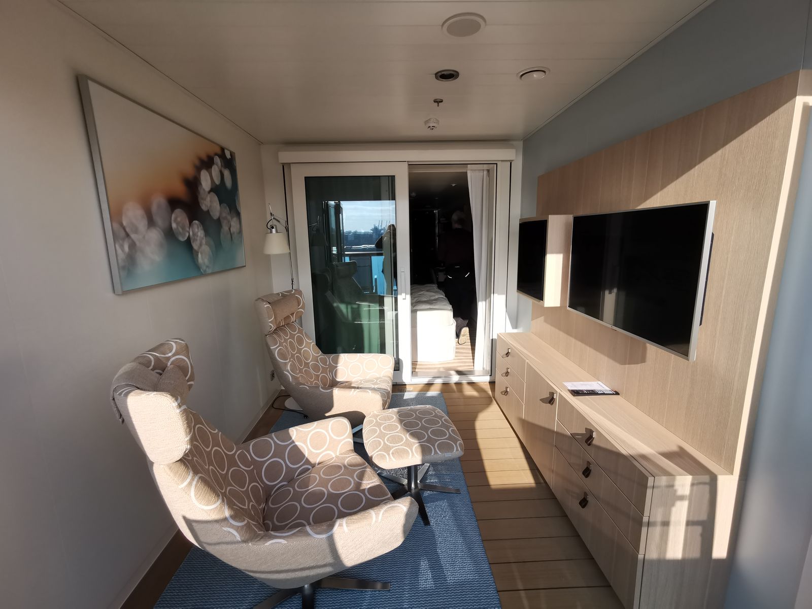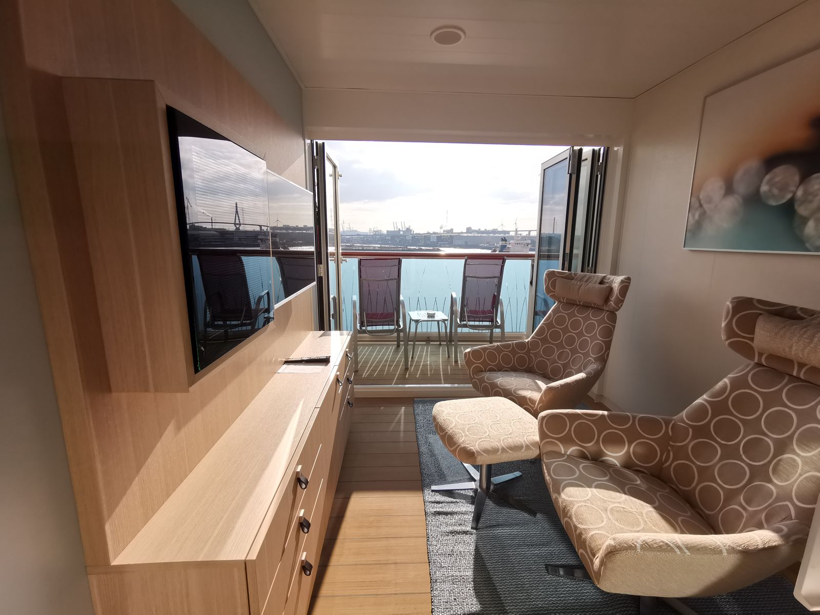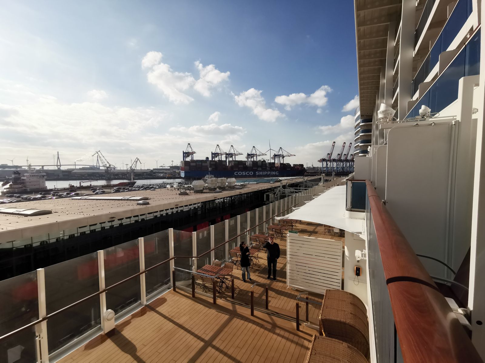 Der Balkon hat eine mattierte Scheibe, weil direkt darunter auf Deck 8 die Strandkörbe stehen und Leute laufen. Schräg rechts unter der Kabine ist der Außenbereich vom Brauhaus.