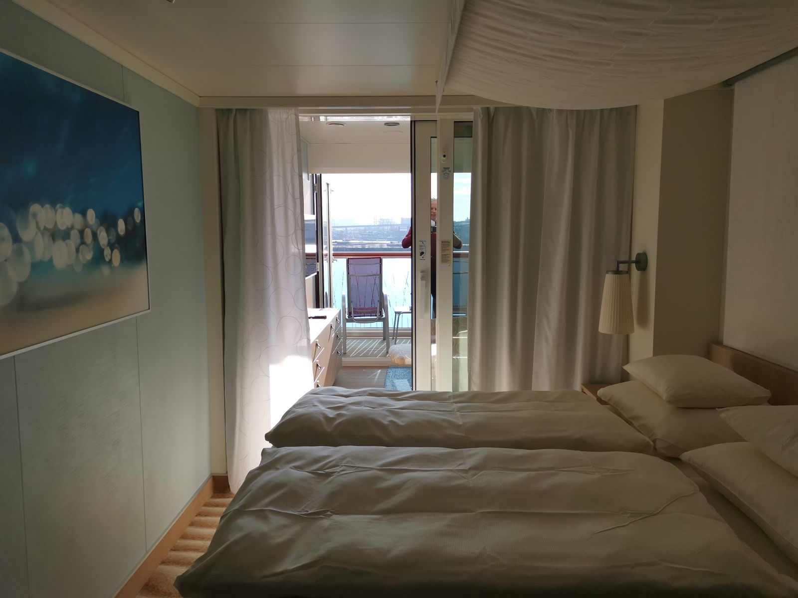 Der Balkon hat eine mattierte Scheibe, weil direkt darunter auf Deck 8 die Strandkörbe stehen und Leute laufen. Schräg rechts unter der Kabine ist der Außenbereich vom Brauhaus.