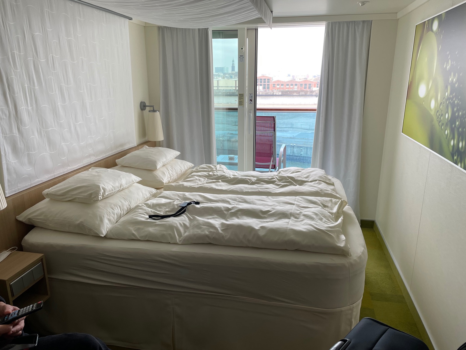 Die Kabine hat 14,29 qm + Balkon, das Raumgefühl ist beengt ☹️ Laut Kabinenfinder soll noch ein Babybett reinpassen…. das kann nicht sein.