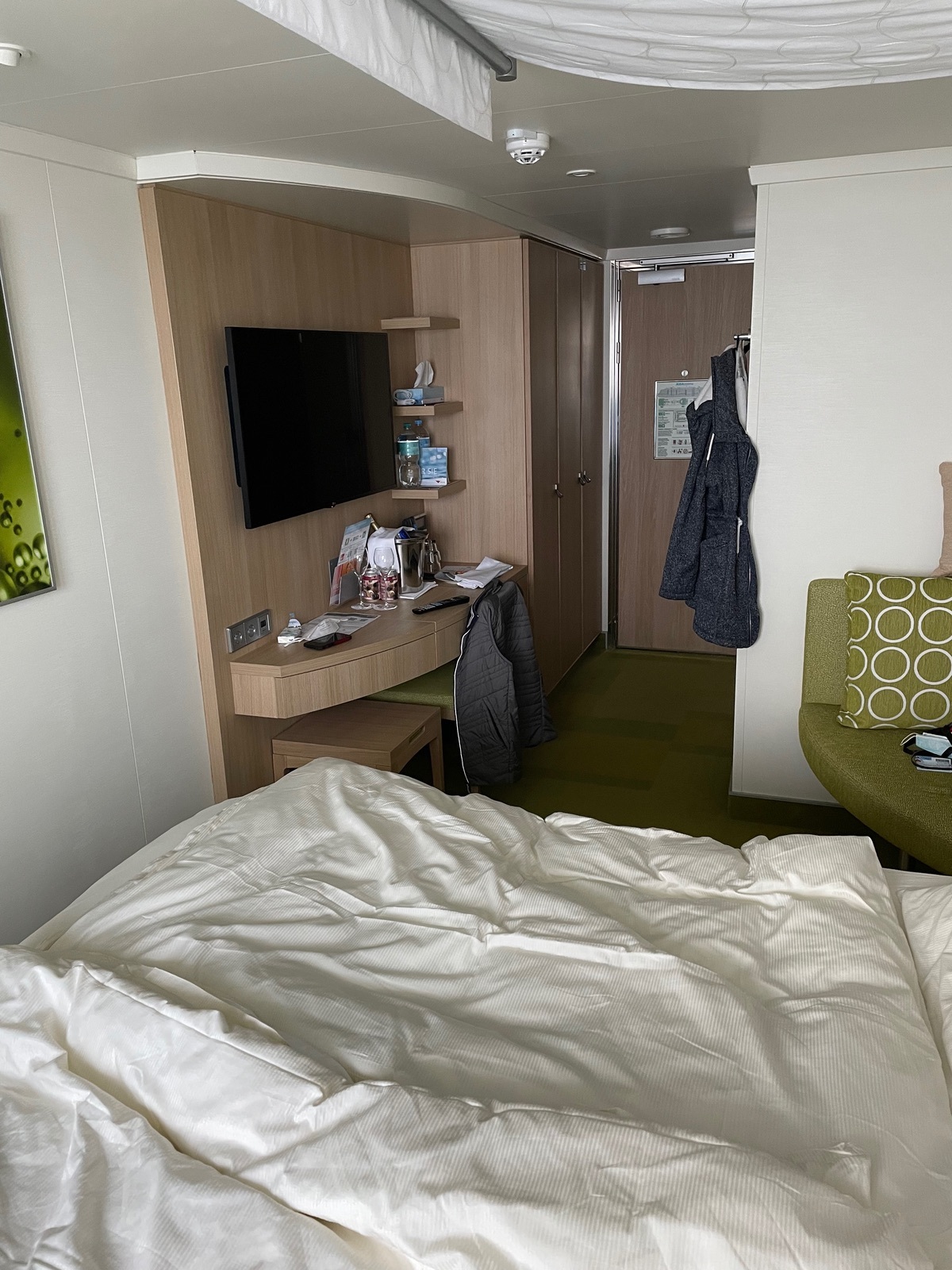 Die Kabine hat 14,29 qm + Balkon, das Raumgefühl ist beengt ☹️ Laut Kabinenfinder soll noch ein Babybett reinpassen…. das kann nicht sein.