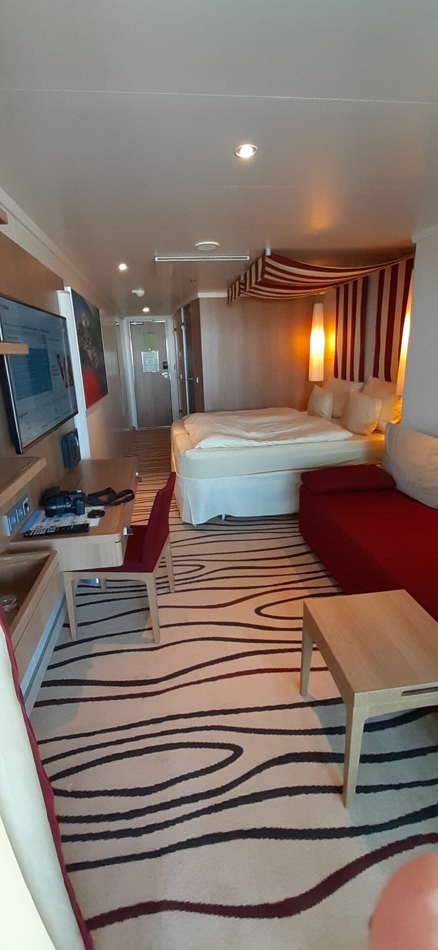 Schöne, ruhige Veranda-Komfortkabine mit begehbarem Kleiderschrank. Dicht am vorderen Treppenhaus, am Beachclub und Pooldeck. Wir haben die Kabine in Premium gebucht und uns auf die Angaben zu benachbarten Kabinen verlassen, dass man in der Kabine nichts vom Beachclub hört. War zutreffend, man hört nichts. Die Entfernung zu den Restaurants ist beträchtlich, schadet aber bei dem guten Essen nicht. Das viele Treppensteigen wurde im Lauf der Woche viel flotter, zur Not gibt's den Fahrstuhl. Das Mobiliar der Kabine ist in Ordnung, nur die Armlehenkissen der Couch sind etwas abgenutzt. Bei Bezug der Kabine war der Türöffner der Balkontür schwergängig und machte einen Höllenlärm. Da wir sowieso zur Rezeption mussten, haben wir dies dort angesprochen. Kaum waren wir auf direktem Weg wieder auf der Kabine, kam 5 Minuten später ein Handwerker und danach war die Tür leicht