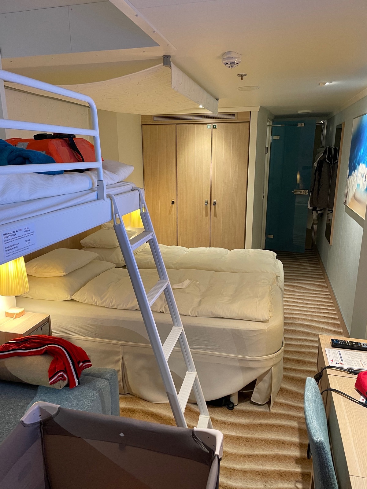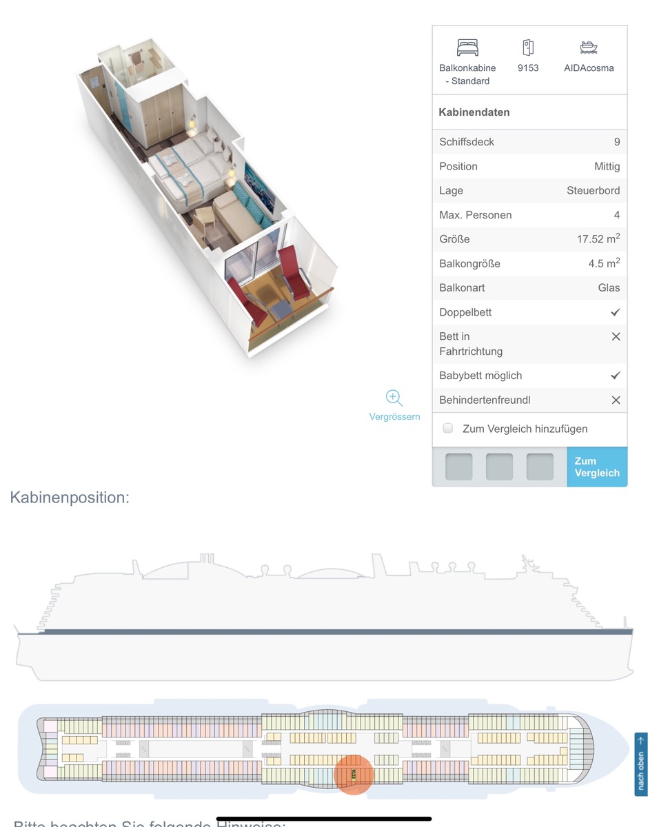 Die Kabine 9153 befindet sich auf der Steuerbordseite und ist die erste in der Rundung. Dadurch ist der ( Glas) Balkon an der rechten Seite breiter. Bewohnt werden kann diese Kabine mit max. 4 Personen ( Fotos für Belegung mit Babybett am Ende des Berichts), die Kategorie wird mit Standard angegeben. Die Lage in der Mitte finden wir in Bezug auf die Wege zu Aufzug/ Treppenhaus gut.