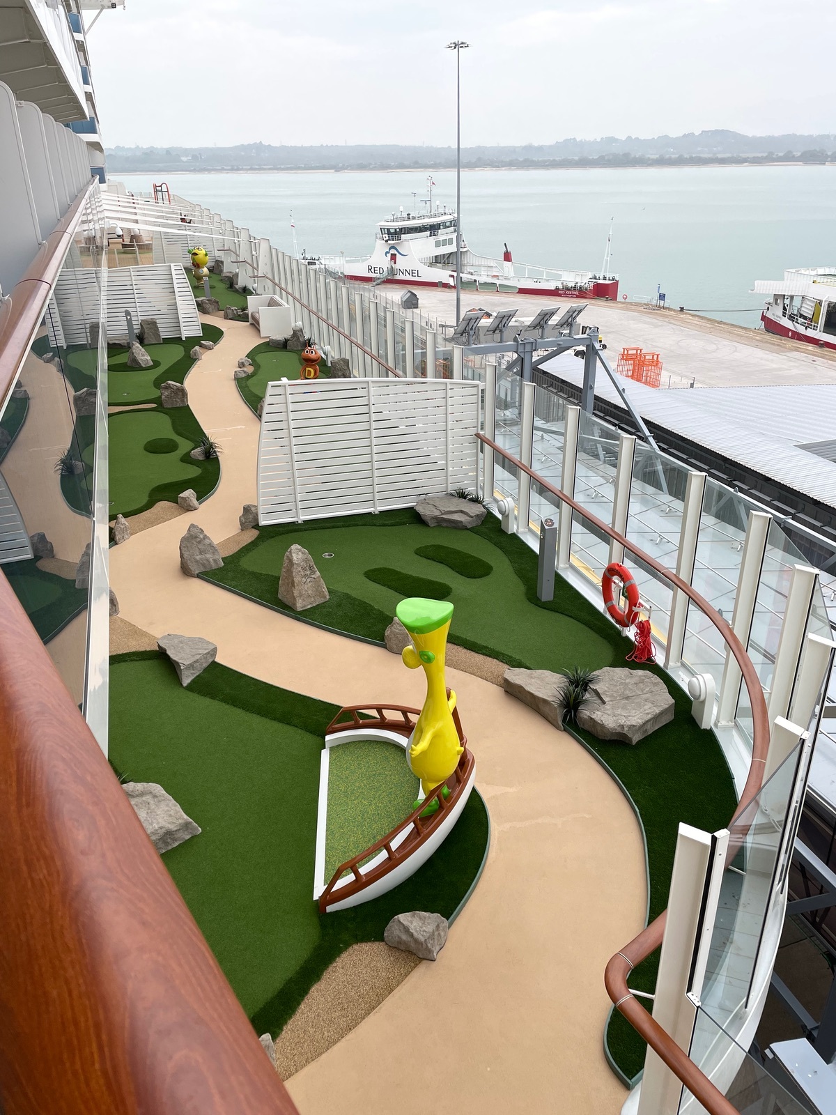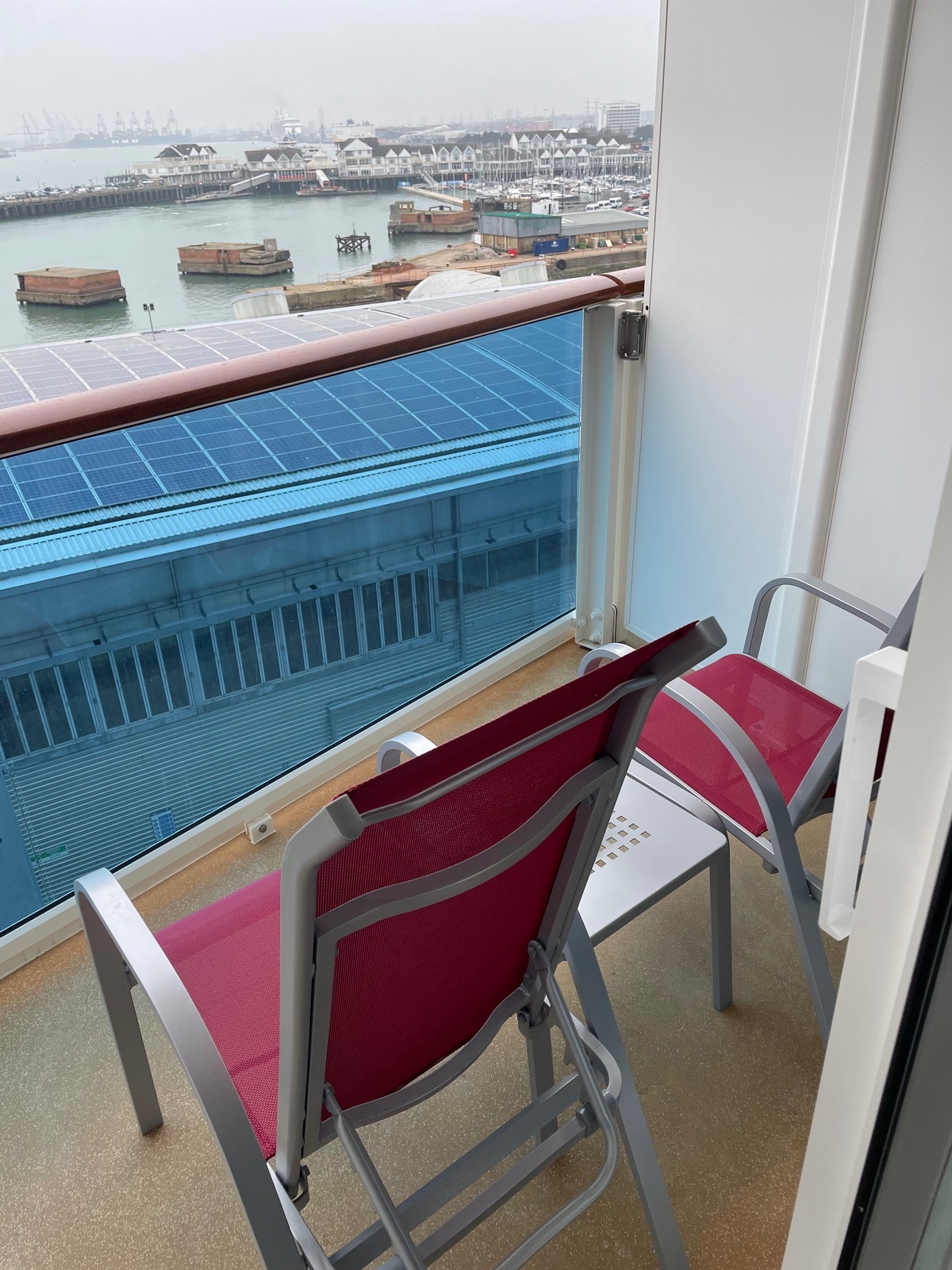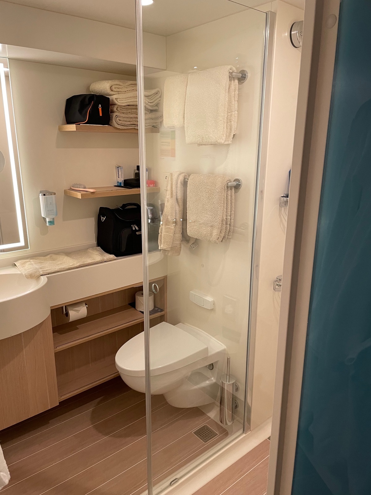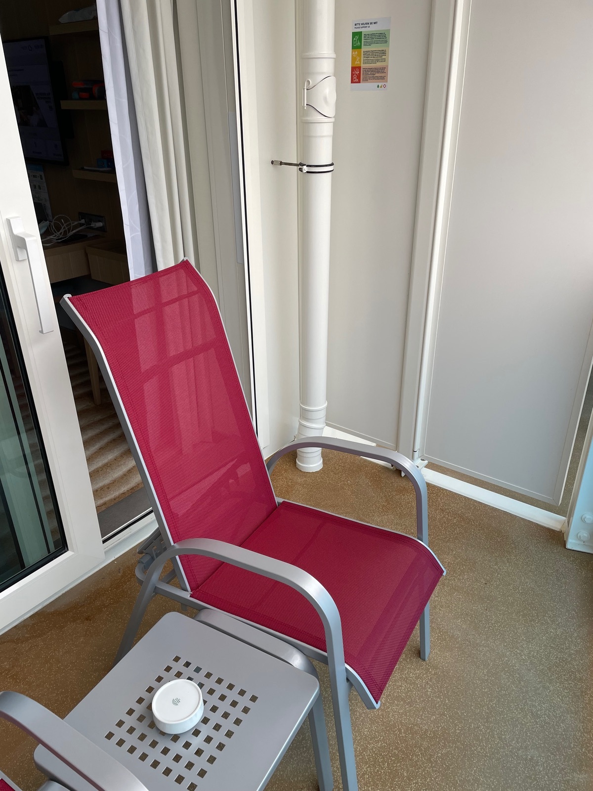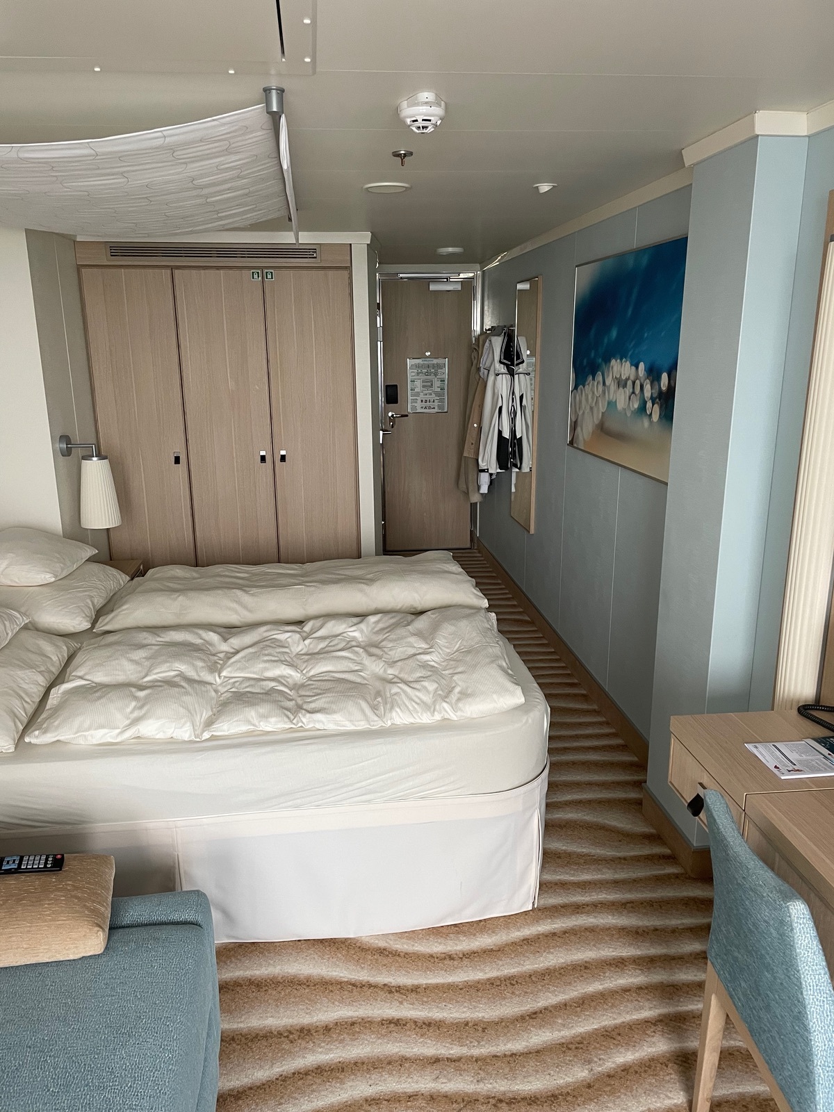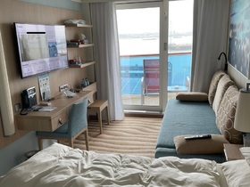 Der Platz in den Schränken ist für 2 Personen ok, für 4 wird es eng. Das Raumgefühl in der Kabine ist gut, wir haben uns sehr wohl gefühlt. Eine Anmerkung zum Balkon bei Regen, das Wasser läuft nicht gut ab. Es bleibt auf der linken Seite stehen, dort ist eine erhöhte Leiste die das Wasser staut. Die Sicht Richtung Heck ist bedingt der Rundung eingeschränkt unterhalb geht es zur Minigolfbahn.