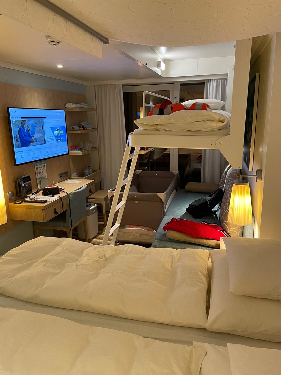 Die Kabine 9153 befindet sich auf der Steuerbordseite und ist die erste in der Rundung. Dadurch ist der ( Glas) Balkon an der rechten Seite breiter. Bewohnt werden kann diese Kabine mit max. 4 Personen ( Fotos für Belegung mit Babybett am Ende des Berichts), die Kategorie wird mit Standard angegeben. Die Lage in der Mitte finden wir in Bezug auf die Wege zu Aufzug/ Treppenhaus gut.