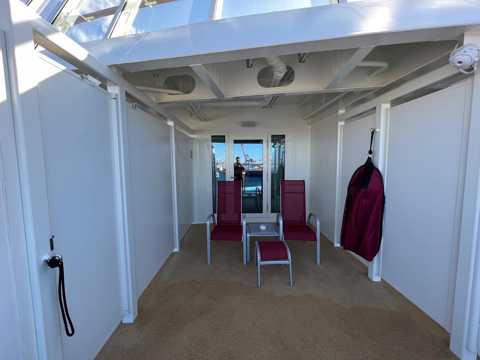 Ein weiterer Nachteil ist, dass direkt über die Kabine ein Sonnendeck ist und die Crew bei uns um 05:45 anfing die Liegen zu verteilen.
