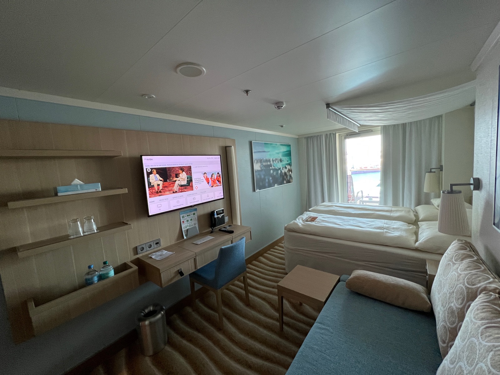 Direkt nach der Duschkabine/Flur kommt der eigentliche Aufenthaltsbereich mit rechts ein Sofa und Links Ablagefächer (für Wasser, Tassen usw), ein ‚Büro‘ mit darüber ein Schwenkbarer Fernseher.