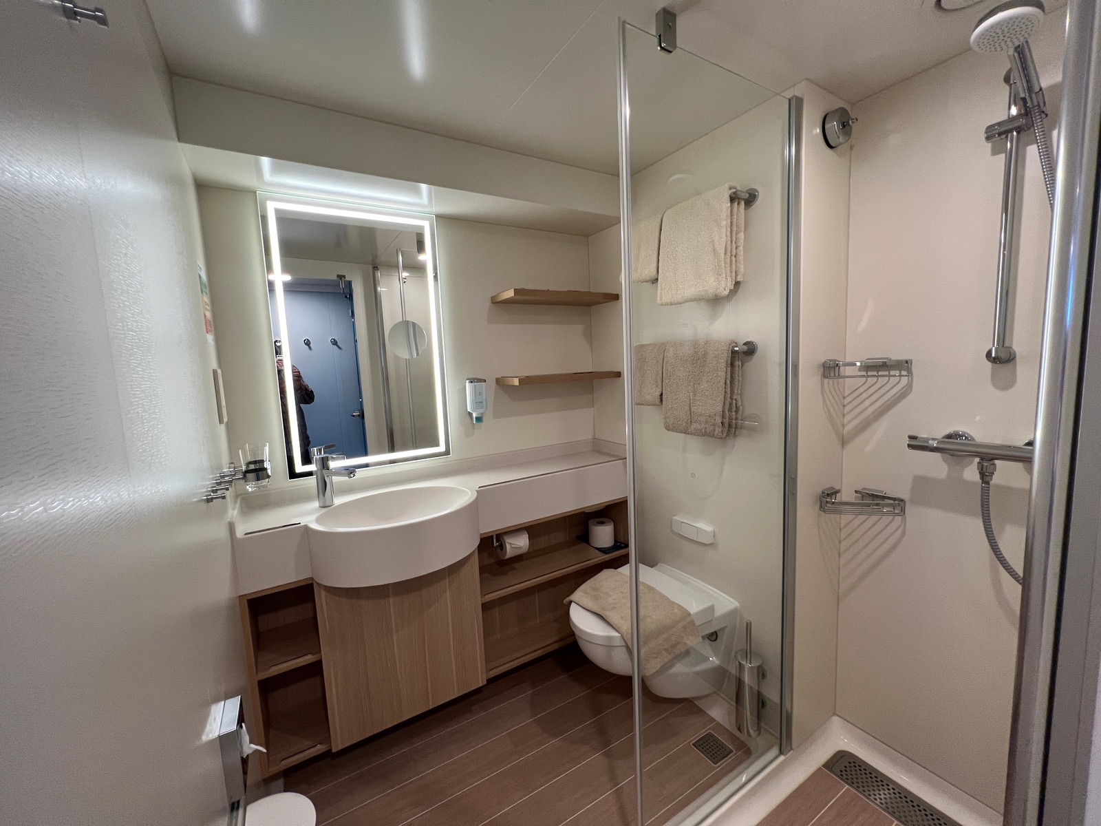Als erstes ist, wenn die Kabine betreten wird, rechts die Duschkabine ist, der im Gegensatz zu Früher nicht mehr so ‚gerundet‘ wirkt und bietet viel Platz.