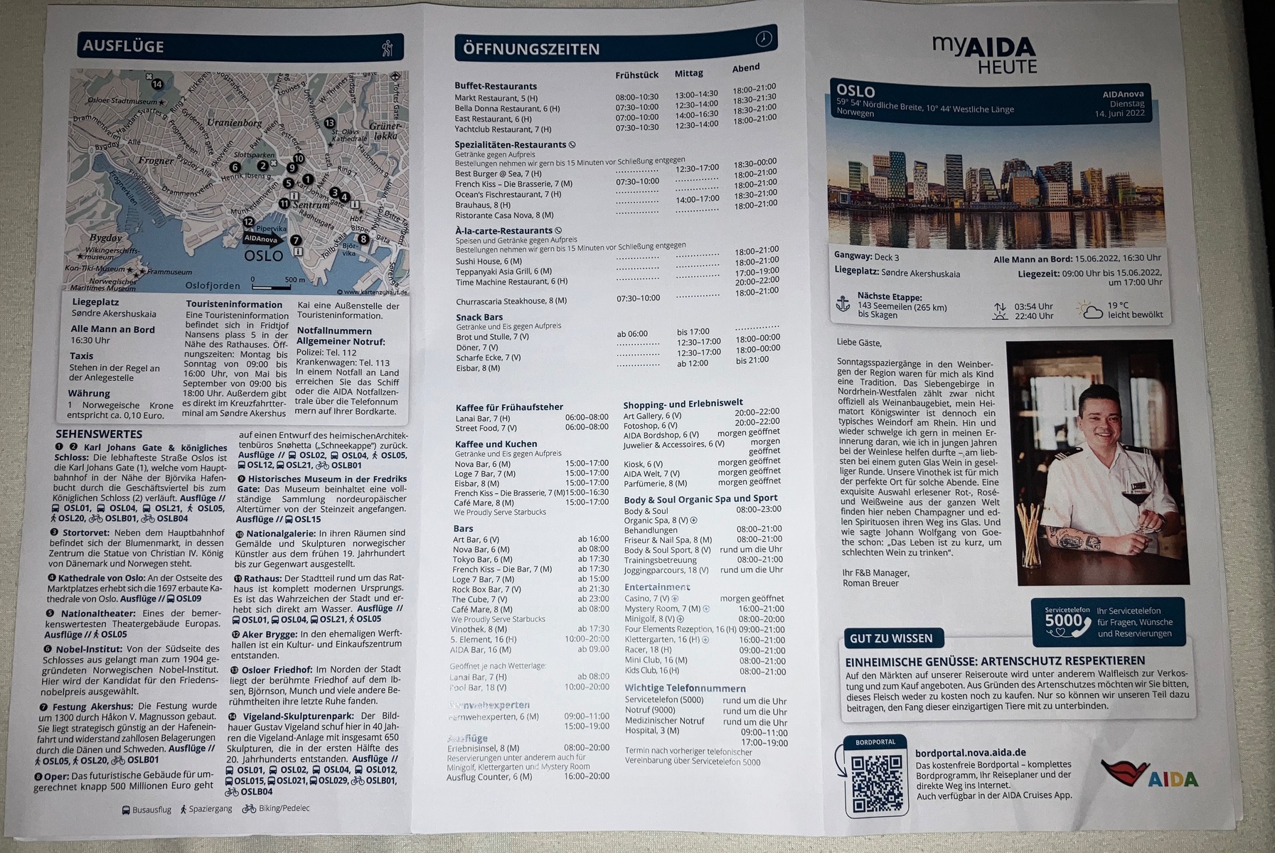 was kann man zu der Tour sagen? Es ist immer wieder toll auf einer Aida zu sein. Skagen und Oslo waren grandios. Das Wetter war im Großen und Ganzen auch super. Aber von den tollen Seiten dieser Tour konnten wir bereits genug lesen.