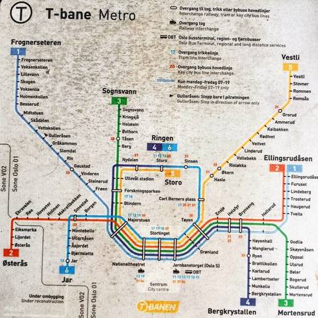 Wenn das Schiff an der Akershusfestung liegt gemütlich in Richtung Nationaltheater laufen. Im 7-Eleven-Kiosk auf der linken Seite des 'Olav Vs gate' gibt es Tickets für die U-Bahn für NOK 39 pro Strecke und Person. An der Bahnstation, mit "T" (= T-Bane) gekennzeichnet, dann den rechten Zugang benutzen und die Linie 1 in Richtung Frognerseteren nehmen. Bis zum Holmenkollen sind es 13 Stationen. Fahrzeit 23 Minuten. Am besten bei 7up sofort auch die Tickets für die Rückfahrt kaufen.