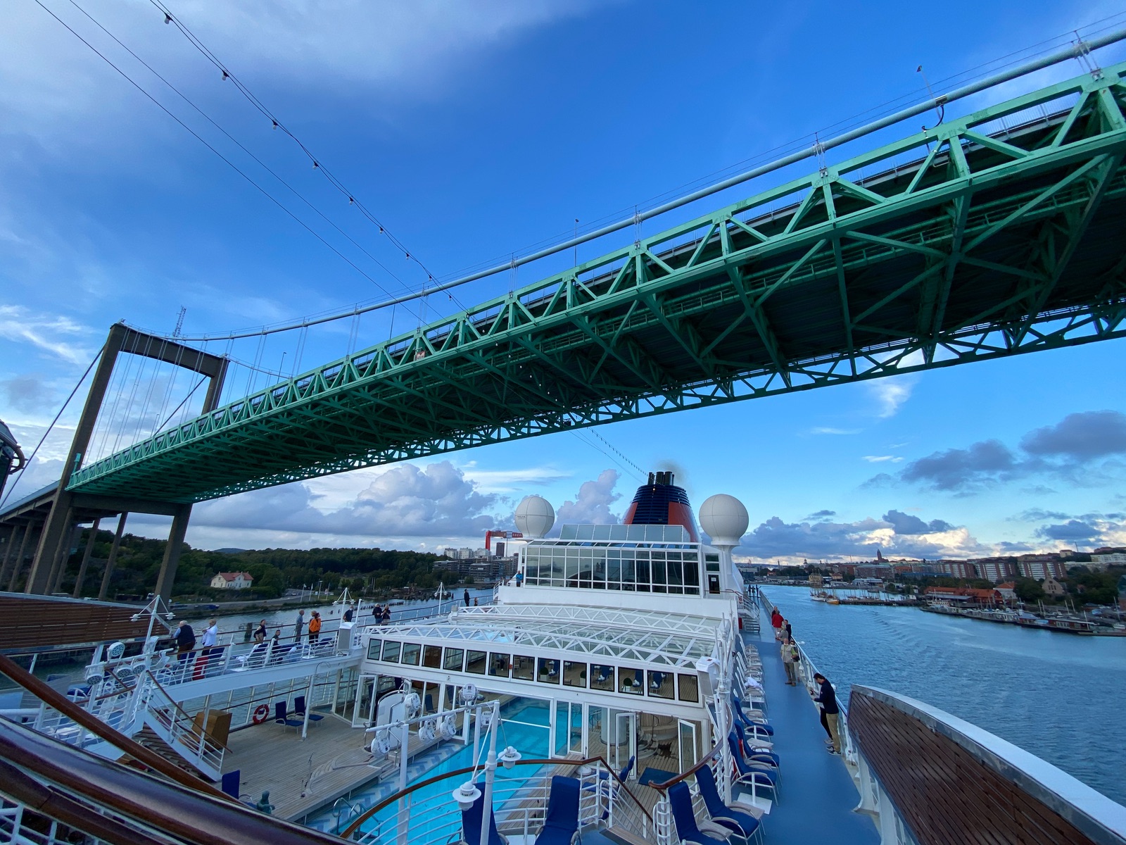 Die Brücke in Göteborg ist das Problem – da passen nur die kleineren Schiffe durch. Wir waren im September 2021 das letzte Mal dort, und so irre viel Platz war da nicht mehr, s. Foto.