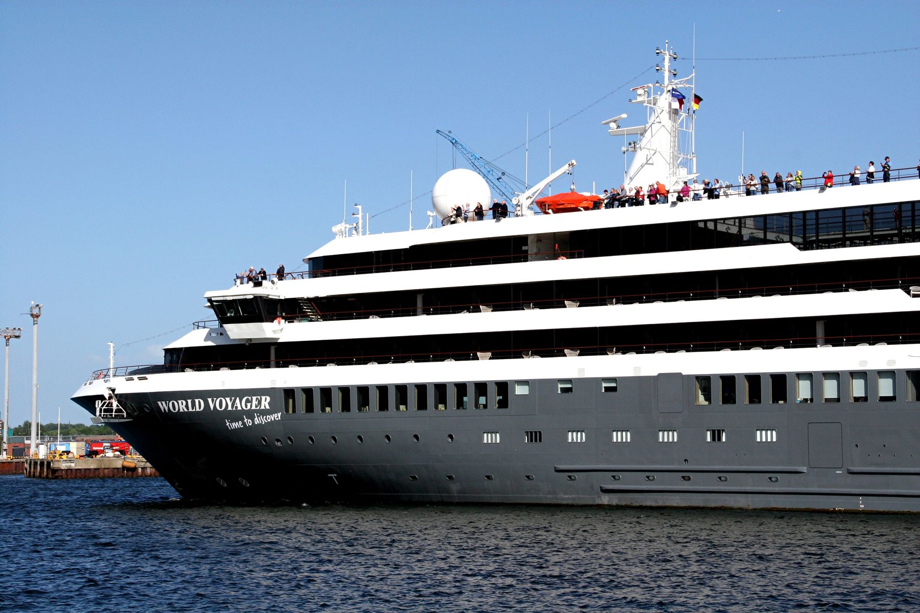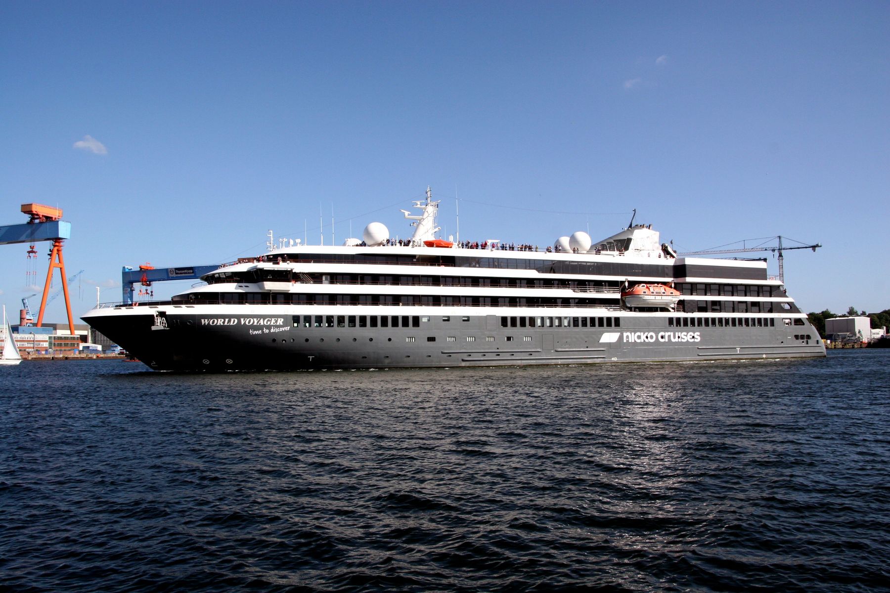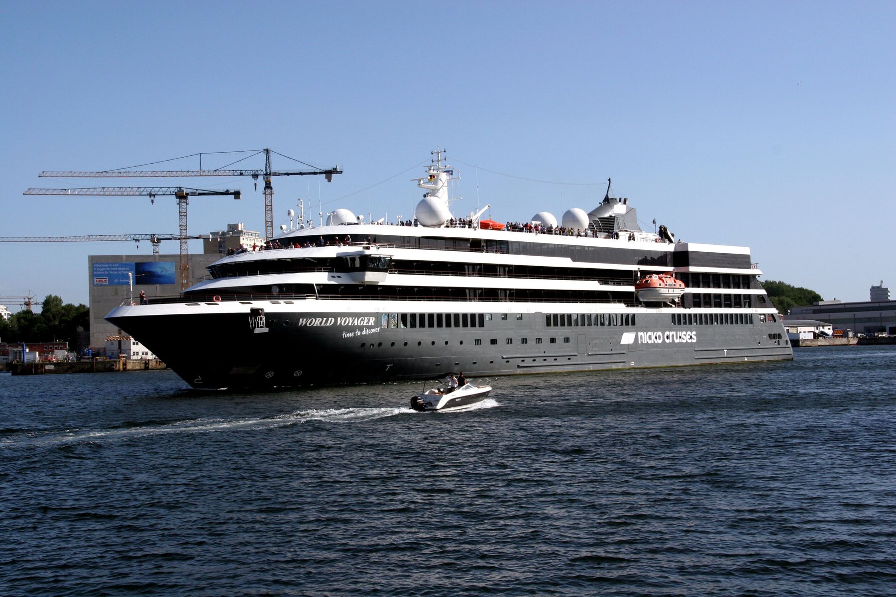 Als ich am 11.06.2022 um 17:33 h zur AIDAnova unterwegs war,hat die schnittige "World Voyager" ihr Auslaufmanöver auf der "Kieler Förde" unter einem azurblauen Himmel gefahren
