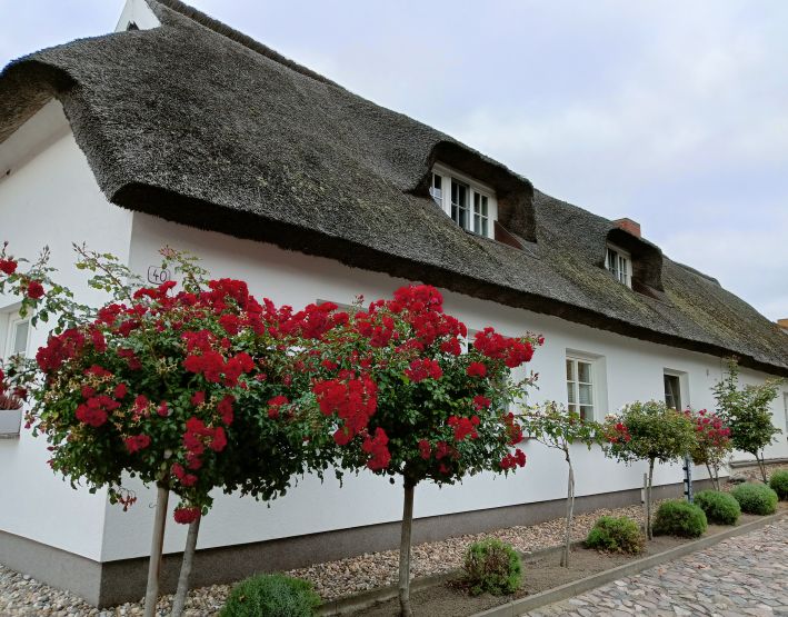 Rings um den Hafen von Schaprode befinden sich hübsche Reetdachhäuser. Man kann in kurzer Zeit dorthin bummeln, während man auf die Ankunft des Schiffes wartet.