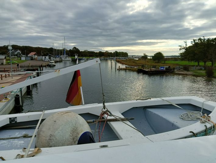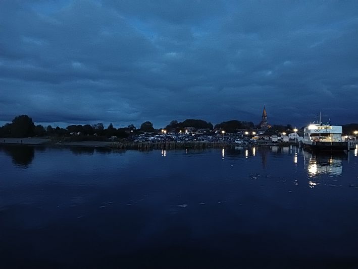 Ich stand und saß die ganze Zeit an Deck und genoss bei einem heißen Getränk den herrlichen Herbstabend und die friedliche Stimmung – wohl wissend, dass sich das Wetter rund 24 Stunden keineswegs mehr so lammfromm präsentieren würde. Eine Sturmflut würde unter anderem die Ostküste Rügens die kommenden drei Tage in Atem halten und Hiddensee würde während dieser Zeit nicht erreichbar sein.