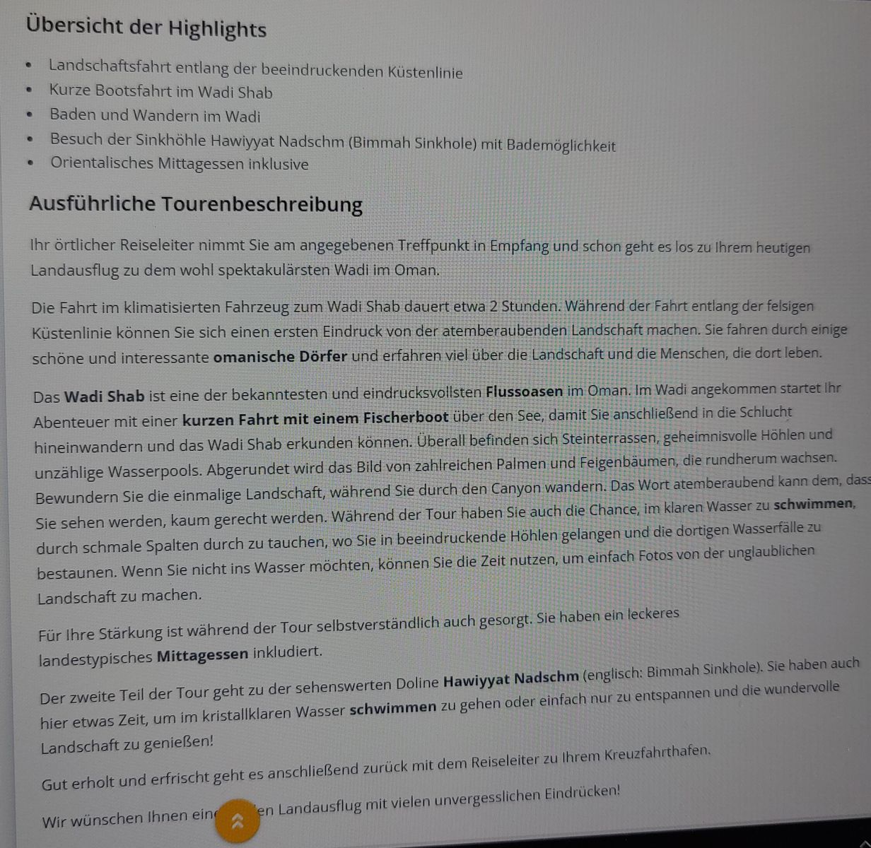Wir hatten noch nach Ausflügen im Oman gesucht und sind da fündig geworden.In Muscat werden wir den Tagesausflug "Naturschönheiten des Omans:Wadi Shab&Bimmah Siinkhole machen welcher sehr gut bewertet wurde.Salalah auch mit meine-landausfluege aber noch nicht sicher