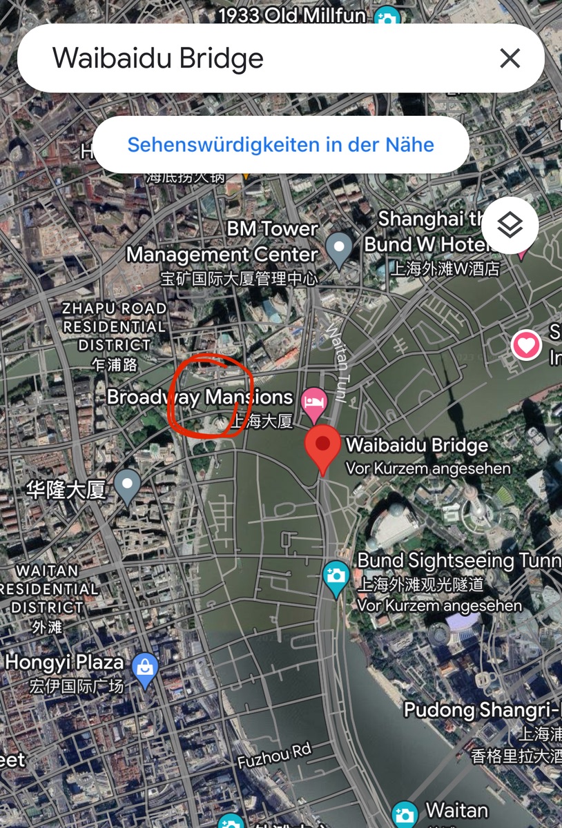 Achtung - vermeintlich blöde Frage: Ist die Ansicht von Shanghai in der Google Maps-App (iPhone) irgendwie merkwürdig? Gerade festgestellt: das Problem besteht nur in der Satelliten-Ansicht. Gefühlt Straßen, wo keine sind…eben wollte ich mir ein Ziel anschauen, dass hier mal im Rahmen einer Tour angezeigt wurde. In der Tourbeschreibung waren auch Kartenausschnitte. Wenn ich nun z.B. die Waibaidu Bridge suche, wird mir die sonstwo angezeigt, aber nicht da, wo sie ist.