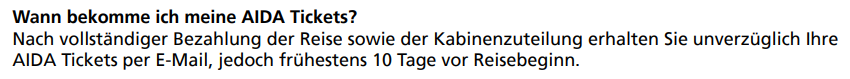 Für Ihre bevorstehende Reise mit AIDAbella sind die Reiseunterlagen bisher noch nicht freigegeben und werden daher noch nicht versendet. Sobald die Freigabe erfolgt, erhalten Sie Ihre AIDA Tickets per E-Mail und finden diese ebenfalls in Ihrem myAIDA Portal unter Dokumente. Ich bitte hier noch um etwas Geduld.