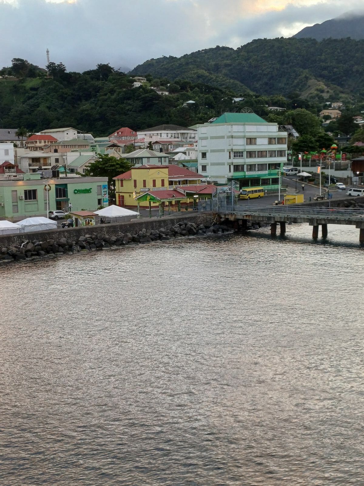Ankunft in Dominica,der Bus im botanischen Garten, der während eines Hurrikans vom Baum erschlagen wurde.Wir sind mit einem privaten Taxi über die Insel und anschließend im Hafen auf ein Bier eingekehrt.