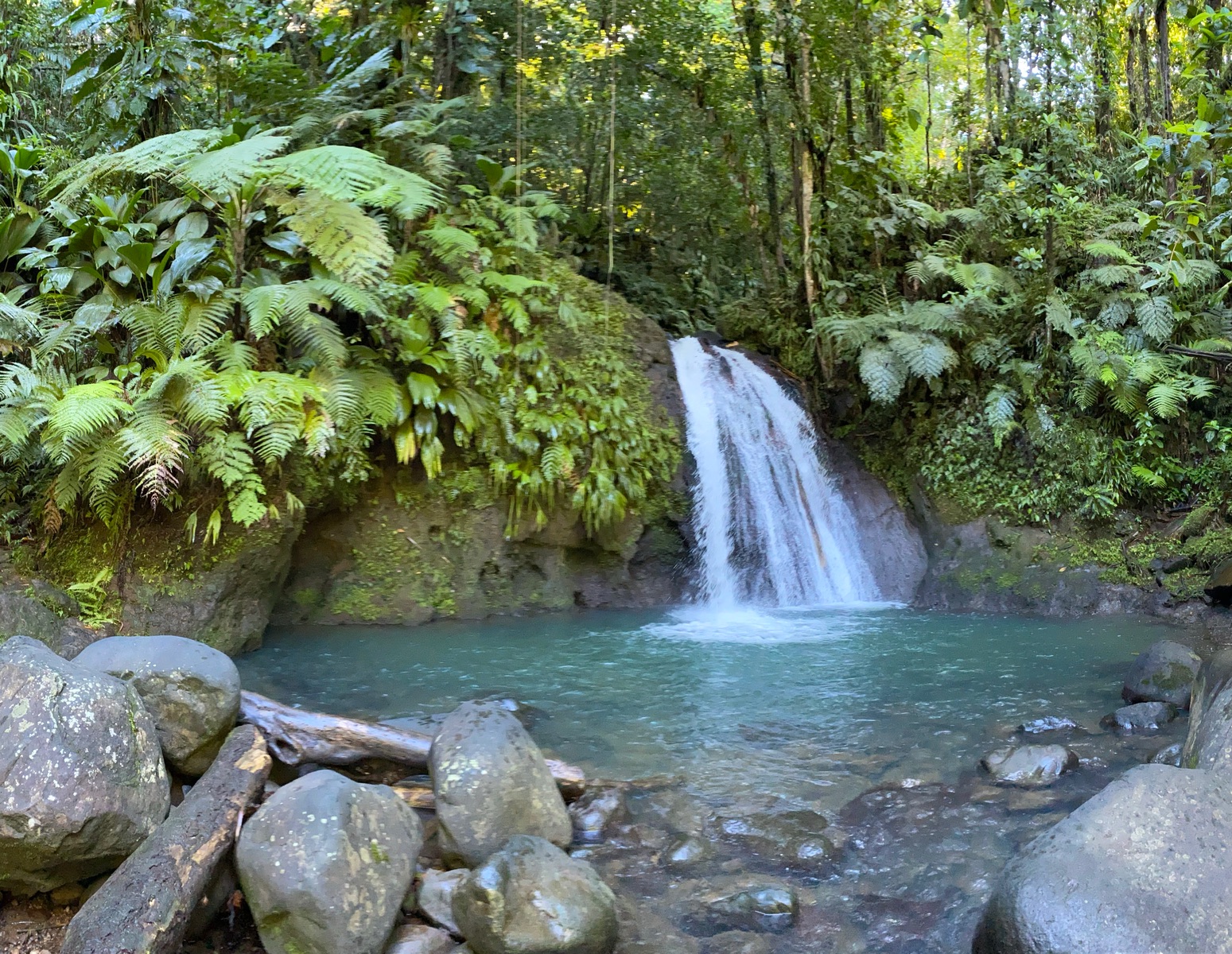 Zunächst ging es zu den Ecrevisses Wasserfällen, wo wir die ersten Gäste waren und die Wasserfälle vor den AIDA Massentourismustouren in Ruhe besichtigen konnten. Nach einem kurzen Fußmarsch durch den Regenwald erreichten wir die Wasserfälle und konnten schöne Bilder machen. Anschließend begaben wir uns auf die andere Flusseite, wo ein Begrüßungssekt gereicht wurde.