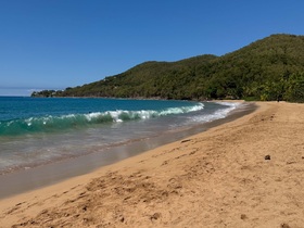 Schöne Schattenplätze und Brandung gabs auch am Strand von Grande Anse