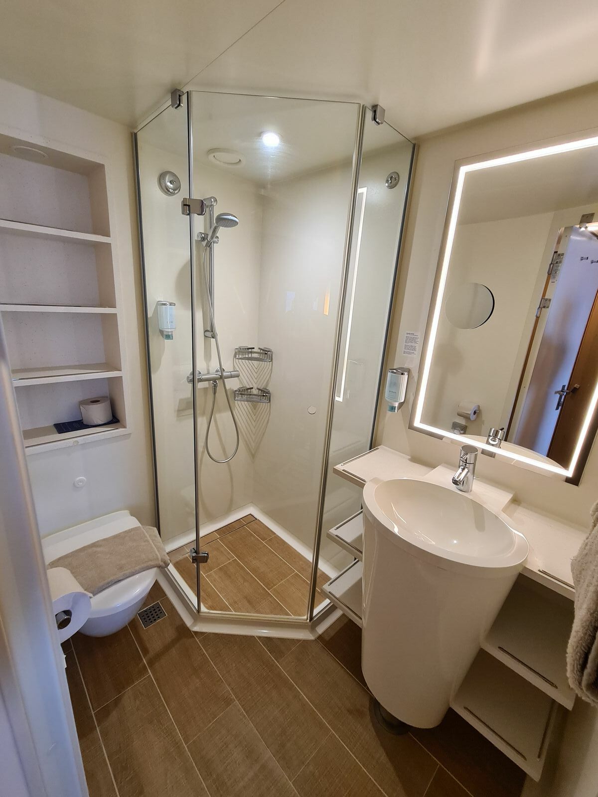 Also soweit alles tipptopp - trotzdem würde ich diese Kabine auf der Perla im Premium nicht mehr buchen. Grund ist, dass die schiffstypischen Geräusche hier auch bei sehr wenig Seegang deutlich zu hören waren. Es handelt sich um eine Art Krachen/Klackern (nicht übermäßig laut), dass sich alles paar Sekunden wiederholt und doch ziemlich nervt. Konnte es nicht lokalisieren. Kam irgendwie von der Balkontüre oder der Decke. Gut, dass ich Ohrstöpsel mit dabei hatte - dann war´s kein Problem mehr.