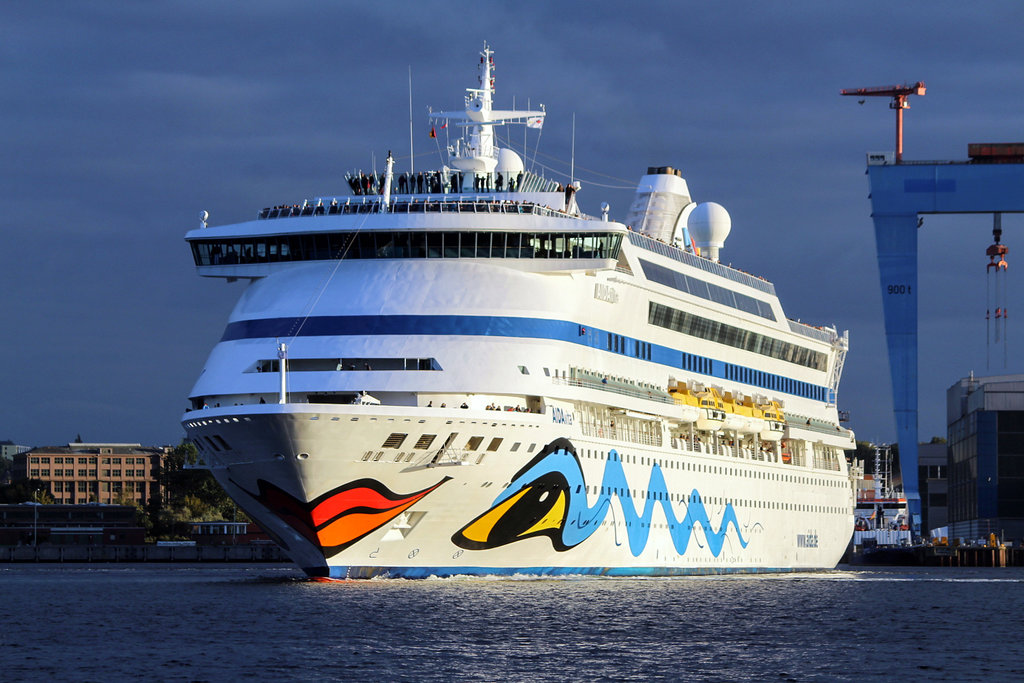 Endlich war es so weit – die AIDAluna löste sich vom Kai. Nahezu gleichzeitig legte die hinter uns liegende AIDAaura ab und drehte auf dem Teller. Die AIDAluna fuhr rückwärts in die Kieler Förde und bewegte sich auf dem Handtuch im Kreise. Die AIDAaura schwamm in unsere Richtung. Als sie uns passierte, winkten wir den zahlreichen Glücklichen auf dem Schwesterschiff zu. Merkwürdig – es kam kaum eine Reaktion. Wo blieb die alte, m.E. selbstverständliche schöne Gewohnheit? Schade – Gruß und Gegengruß bei diesem freudigen Anlass ist doch etwas Schönes, tut nicht weh und niemand bricht sich einen Zacken aus der Krone …