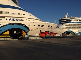passend zum Beitrag Nr.170 mit den "Schwestern" AIDAvita und AIDAaura während ihren Auslaufmanövern, gibt es jetzt noch die beiden Dampfer an ihren Liegeplätzen am Ostseekai
