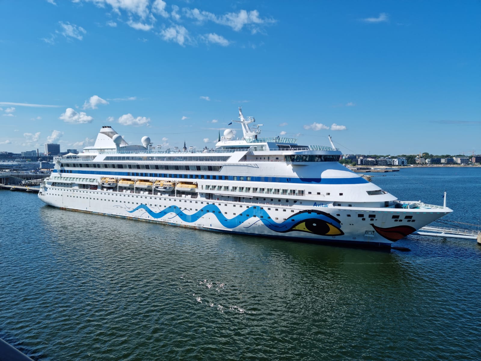 Mal wieder eine kleine Info von mir , Webcam der Europa . Man sieht recht deutlich den Avitak Schriftzug an der Backbordseite . Dazu die Brücke und die vorderen Balkonkabinen backbord .