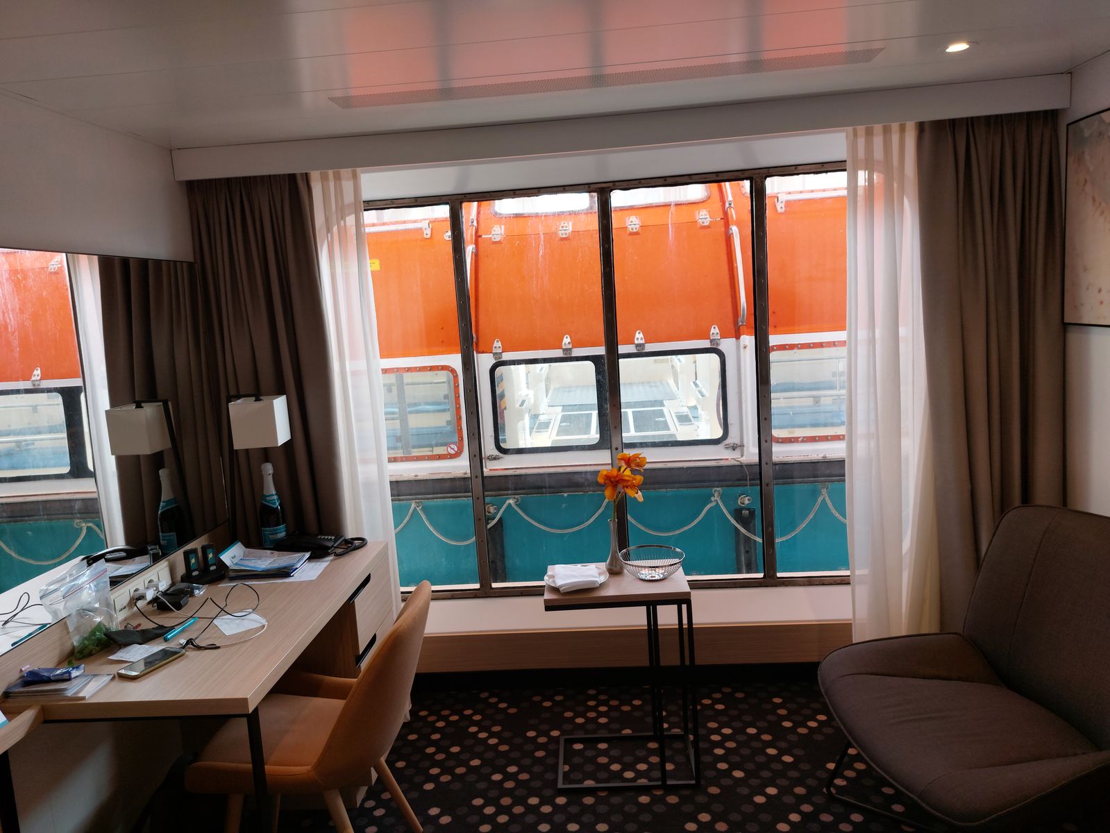 Wer also mit der mehr oder weniger starken Sichtbehinderung (es gibt hierfür auch 2 Preiskategorien) zurechtkommt oder die bessere Alternative zur Innenkabine sucht, ist hier bestens bedient. Die Fenster sind bodentief und reichen fast über die gesamte Kabinenbreite. So kommt von oben und seitlich noch genug Licht in die Kabine.