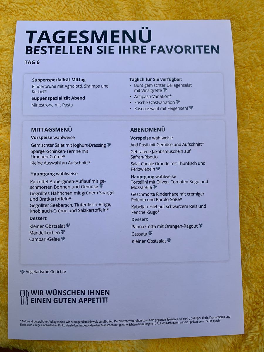 Der Arzt der uns im Hospital "behandelt" hat war ein Deutscher, auch die Krankenschwester. Medikamente brauchten wir nicht. Der Verlauf war sehr leicht. Es erfolgte jeden Tag ein Anruf, wie es uns geht und ob man etwas für uns tun könnte. Das Kinoprogram durften wir kostenlos schauen. Nach 7 Tagen wurden wir erneut getestet und konnten dann in unsere alte Kabine umziehen. Auch hier wurde uns geholfen.
