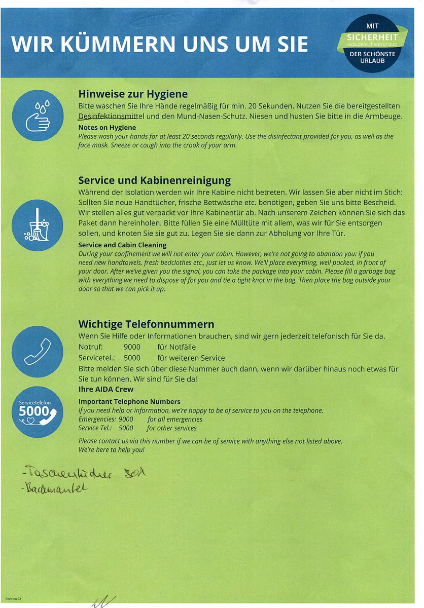 Auch die Kontaktpersonen bekamen die Zettel, um sich das Essen für den Folgetag zu bestellen und es wurde von dem gleichen,ausgesprochen netten Mitarbeiter aus dem Bella Donna direkt in die Kabine geliefert, der auch die Gäste im Quarantänebereich betreute.