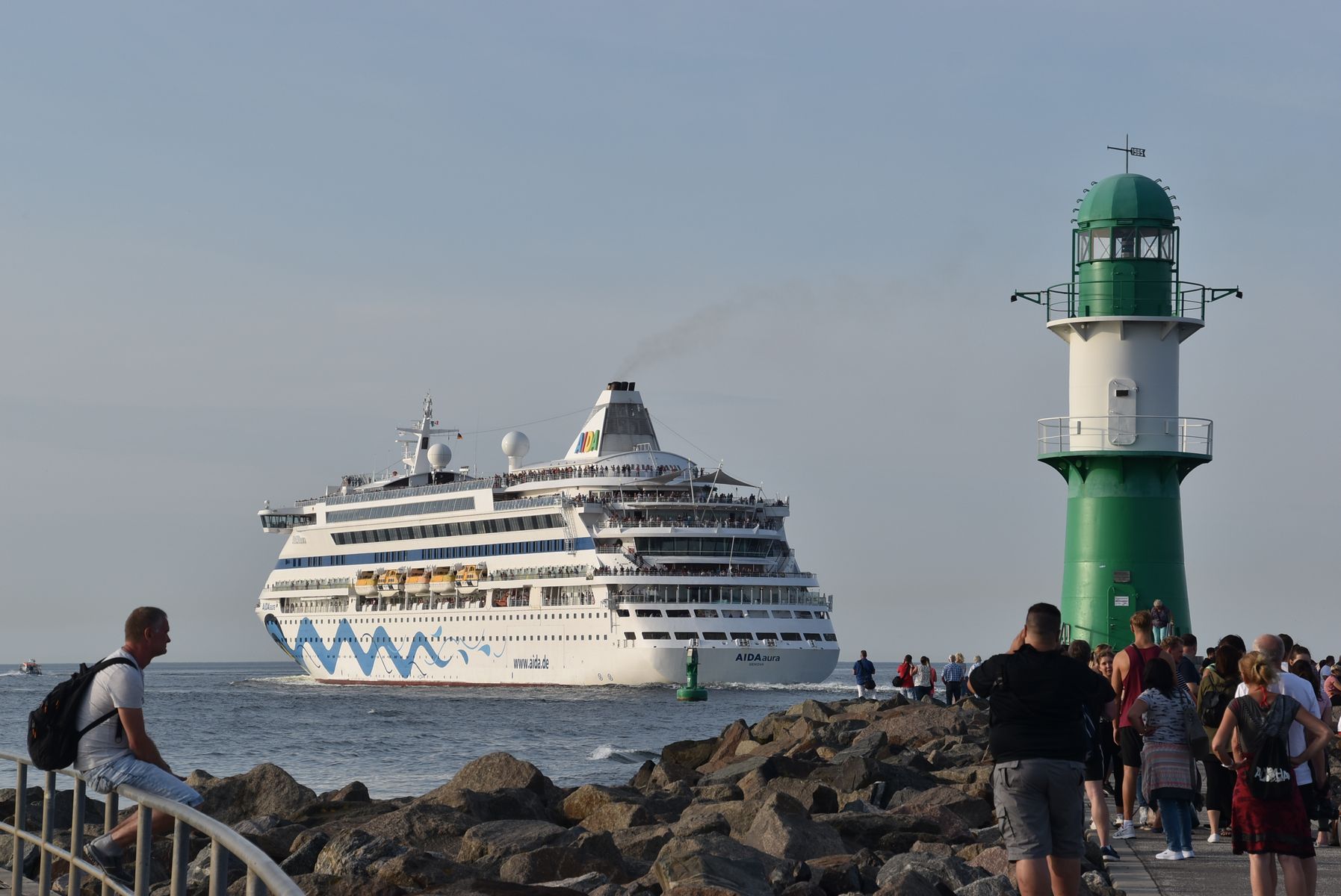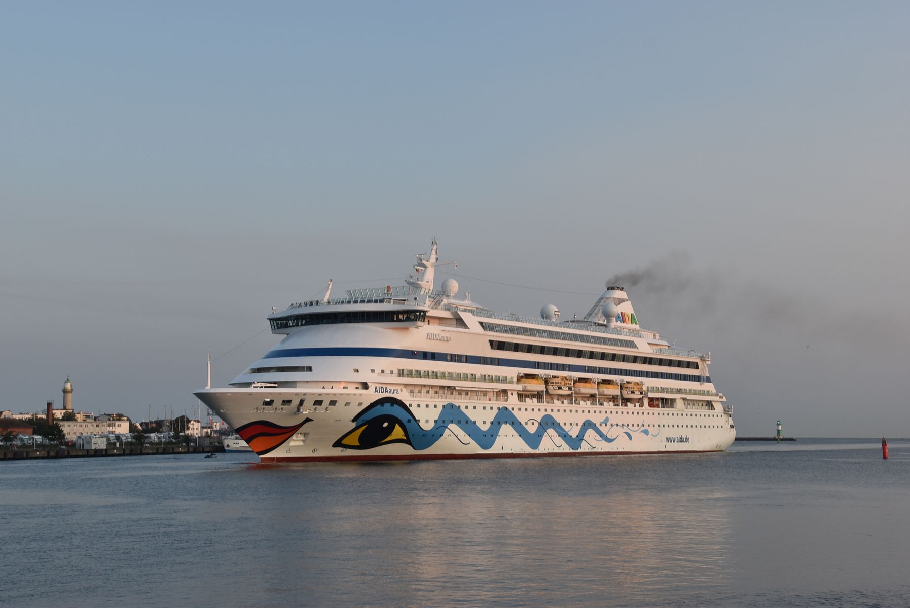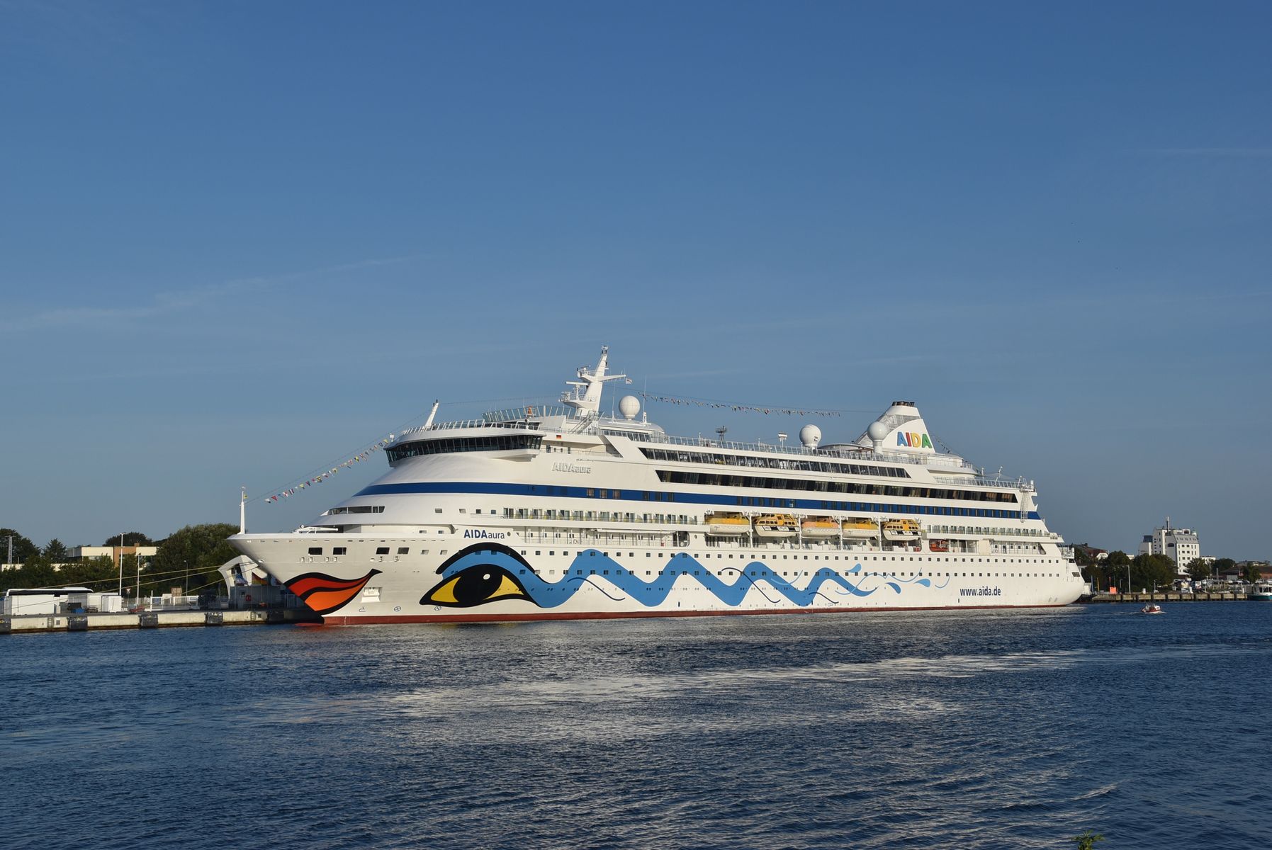 Nach dem "Kuß" mit der MSC Preziosa dreht die AIDAaura mit ihrem kräftigen Bugstrahlruder vor der Flaniermeile "Kiellinie" auf dem "Teller"