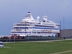 Also ohne Gewähr: Sie steht "vor" dem Kreuzfahrtterminal. Wenn Du vom Atlantic den Deich Richtung Cruise Center lang läufst kommt erst die Aura und dann das Cruise Center (heute mit der MS3).